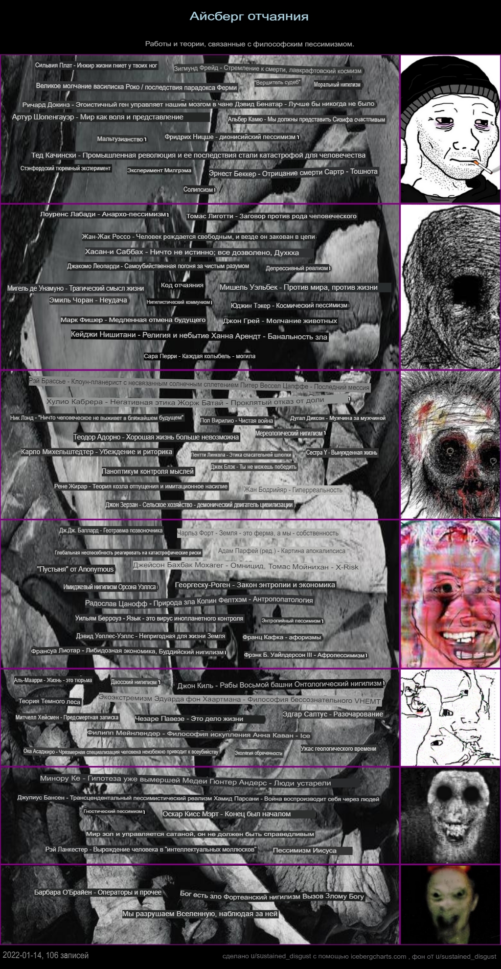 Лично для меня пессимизм это линия эскапизма и способность коупить лично свою, отвратную и неудавшуюся жизнь. Я не считаю что "быть живым это плохо", я считаю что разве что быть живым мне и такому как я плохо. И у нормисов, которые живут нормальной или даже превосходной жизнью (в плане вкладываемых усилий, результатов, здоровья, красоты, богатств) не будет такой отдачи, такой реакции на пессимизм, потому, потому что он не конгруэнтен их опыту. Говорить с удавшимися, богачами, красавицами про пессимизм - это как к тебе будут подходить на улице и говорить что в индии дети тонут в реках из говен. Более того, сам "пессимизм" нельзя ухватить и определить как что-то единое и абстрактное, как один набор правил. Короче, для меня это смазка чтобы ёбка от жизни была не столь болезненной, и я увидел, что я не один. И чем тяжелее период жизни, чем ничтожней низводит отчаянье - тем глубже и к более радикальным творцам обращаюсь. Какая-то чернуха, смерть, голод, шприцы, Птетенька, поедающий прыщи или мемуары смертельно больного - именно это отдохновенье. То есть, оптимизм дочки-красавицы кабан кабаныча оправдан, и она объективно не столкнётся с трудностями и болью, с котороц столкнётся никчёмный абортыш.