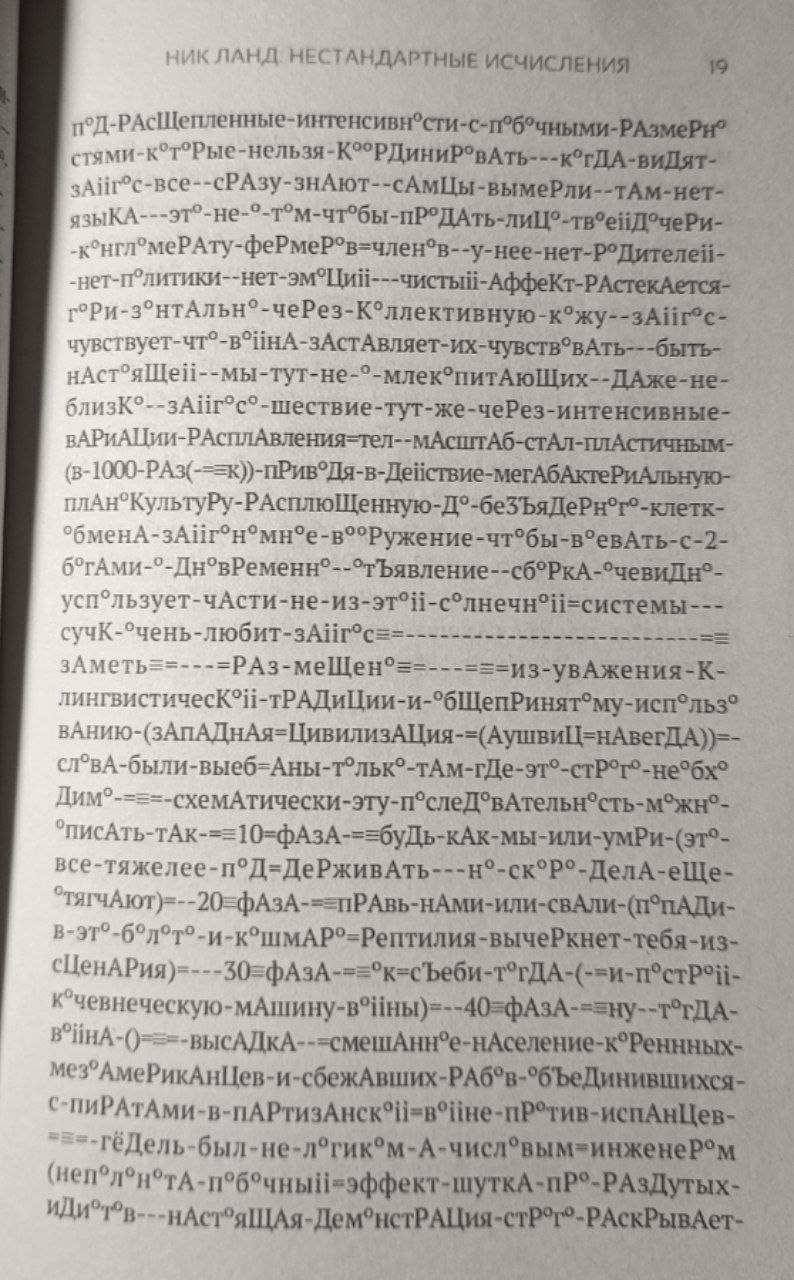 >>157486 Прочитал Нестандартные исчисления, а вмесчте с ней всё о Нике Ланде, вышедшее на русском. 1. Зиг○тическАя -==х=к○ДА (варим л0бстер0в) - 13 страниц миксера в глаза. Вроде слова коннектятся и подходят друг к другу, но получается шизофазия. Жду оцифровку книги,чтобы ○ перевести в О и нормально прочитать. "..запрыгни на геноцид экспресс и каждый захочет обсыпать тебя деньгами и выебать тебя до потери сознания - вот это Аушвиц навсегда" 2. Механомика - не лезь сюда если ты профан в математике, не шаришь за Кантора и Гёделя. Написано тоже сложно 3. Нестандартные исчисления - прикольный трансгрессивный текст после прошлых двух. Иногда прослеживается связь между предложениями и даже абзацами. 5. Введение в йцукеномику - короткая глава, желательно знание линала и информатики 6. Введение в каббалу - первые параграфы критикуется "профанная нумерология" и выставляется в хорошем свете каббала как гиперверовательный механизм и деантропный поиск Внешнего 7. Критика трансцендентального мизебарализма - критика марксистов с позиции акселерационизма 8. Шрязная шутка - прикольный weird трип 9. Телеоплексия - сложный текст, манифест акселерационизма. Первое прочтение едва ли внесло ясность в понмание текста целиком, и ничего не дало тому, кто уже шарит за акселерационизм 10. Шансы и цели. От математики и теории вероятности переходим к экономике и ИИ. Для прочтения нужно быть прокачанным во всех этих сферах. ------------------ ГИКК - серия weird-рассказов, вдохновлённых Лавкрафтом. База не требуется 11. (Ид)онтичность - понравилась глава "я была марионеткой ГИКК" 12. Клуб Ктулху - весьма затянутый ряд историй, где раскрывается гиперверие, лемурианская магия и путешествие во времени. Первая часть про Берроуза, открывшего гиперверие, вторая про исследователей племени в Индонезии.