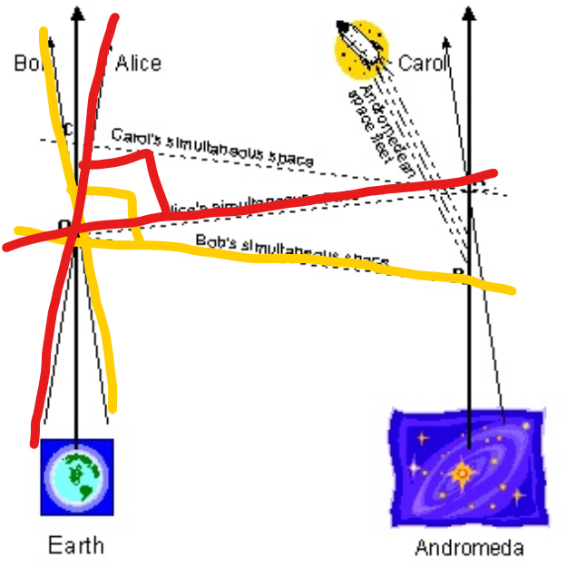 Настоящие момент на этом рисунке, это перпендикуляр к вектору движения, то есть сечение пространства через точку времени. Легко видеть что "скрины" алисы и боба пересекают путь галактики в правой части в разных точках. Конкретно на этом рисунке до вылета корабля у алисы и после у боба.