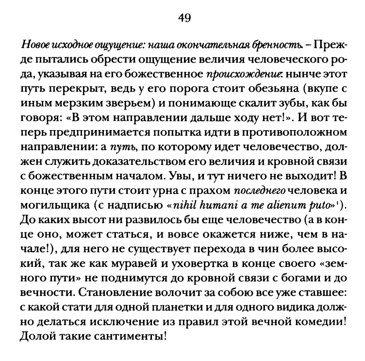 «самим фактом обернувшейся на себя, выступающей против себя души животного на земле появилось нечто столь новое, глубокое, неслыханное, загадочное, противоречивое и перспективное, что благодаря этому сама конфигурация земли претерпела существенное изменение. Действительно, понадобились божественные зрители, чтобы отдать должное завязавшейся таким образом комедии, чей исход остается еще совершенно непредвиденным, — слишком утонченной, слишком чудесной, слишком парадоксальной комедии, чтобы позволительно было разыгрывать ее бестолково неприметным образом на каком-нибудь забавном созвездии!» (ГМ2)