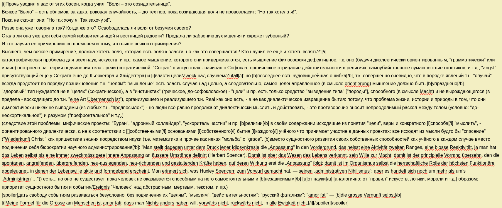 >В конечном этапе суждения ты вообще не различаешь этот концепт по содержанию. Чья воля? Фанета? "Свет" Бёме? Natura naturans Шеллинга? "Зевс" Гераклита, которого он называет "Зевсом" лишь из уважения? Или это Демиург из "Тимея"? Это вообще просто мифы и легенды народов мира, не совсем понимаю как они относятся к теме (Или, если рассматривать это с очень серьезным озабоченным лицом, к чему я не склонен, это "история европейской метафизики", которой Ницше был завершительной частью по Хайдеггеру, и его проблема мол была именно в том, что он был ее частью)