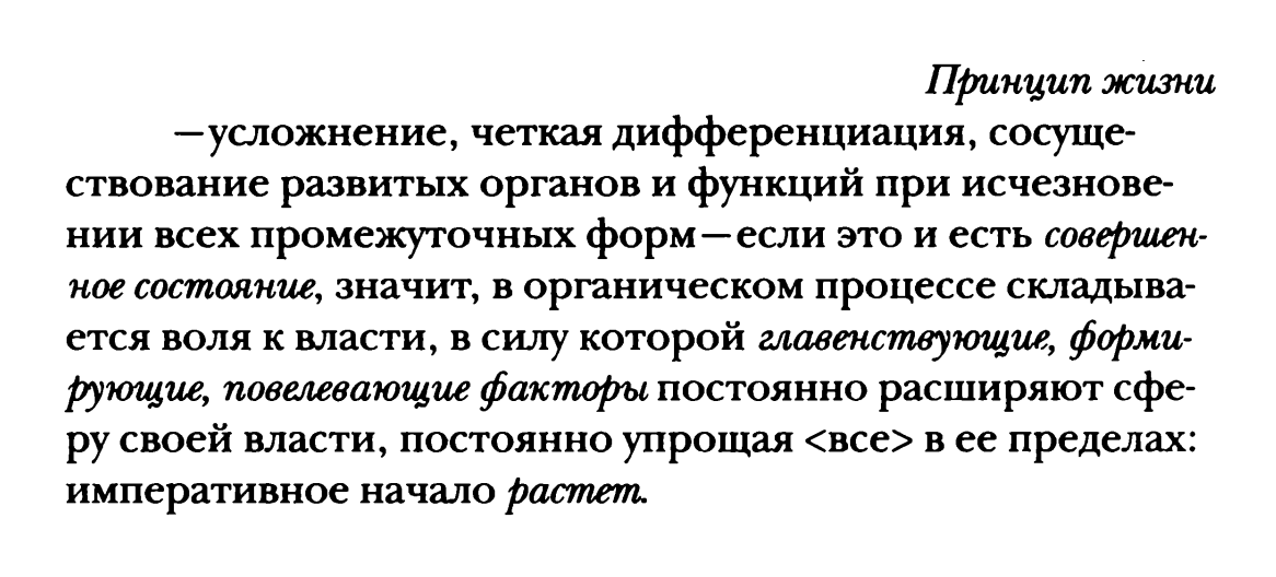 «Чем характеризуется всякий литературный décadence? Тем, что целое уже не проникнуто более жизнью. Слово становится суверенным и выпрыгивает из предложения, предложение выдаётся вперёд и затемняет смысл страницы, страница получает жизнь ценой целого — целое уже не является больше целым. Но вот что является образом и подобием для всякого стиля décadence: всякий раз анархия атомов, дисгрегация воли, "свобода индивидума"»...