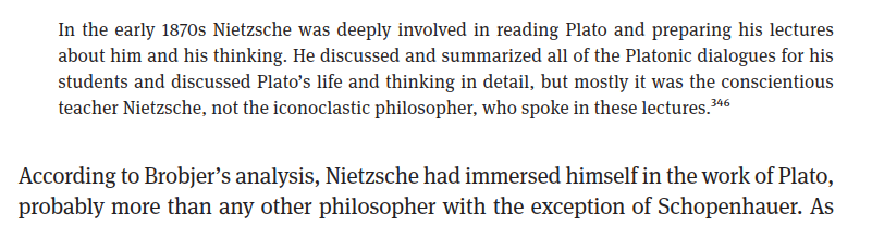 >>180162 >Ницше не получал систематических знаний по философии и истории философии из первоисточников Как и большинство философов до 20 века. Ницше хорошо знал философов, которые ему нравились — Шопенгауэра, Платона, досократиков. Читал также всякие рандомные книжки, например Дюринга. В античной философии так вообще очевидно разбирался ЛУЧШЕ чем любой немецкий идеалист, может чем ЛЮБОЙ (серьезный, не филолог как Шлейермахер) ФИЛОСОФ 19 ВЕКА. Потому что полистать диалоги Платона в переводе ну это может быть даже хуже, чем внимательно проштудировать книгу крутого специалиста по Платону. Например Кант скорее знал Платона как "полиставший" (и все остальные, как в 19 веке так и в 20, о том что раньше даже не говорю).