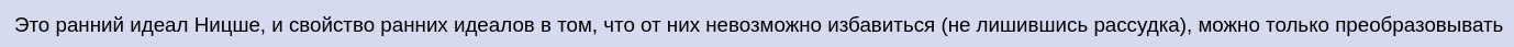 >>181685 "объектом атаки рессентимента служит только антагонизм ошибочно направленной реакции" - т.е. ресентимент атакует в состоянии антагонизма/реакции, но всегда ошибочно, и не способен корректно определить "причину" или (необходимо) предмет который требует внимания: с точки зрения диалектики и ницшевской логики, ресентимент всегда слеп, глух и недееспособен: следовательно, диагноз т.н. "слабым" и "неудавшимся", "рабам" и прочим жаргонным обозначениям внутри сугубо ницшевской тематики (рабство даже не в смысле Шеллинга:"... труд является позором, потому что бытие не имеет ценности само по себе; но если это бытие заблестит в заманчивом украшении художественных иллюзий и будет казаться действительно имеющим ценность само по себе, то и тогда положение, что труд есть позор, останется в силе, а именно – из-за сознания невозможности, чтобы человек, борющийся за простое выживание, мог бы быть художником. В новейшее время общие представления определяет не нуждающийся в искусстве человек, а раб: и как таковой, согласно своей натуре, он, чтобы жить, должен обозначать все отношения обманными именами. Такие призраки, как достоинство человека, достоинство труда, являются убогим созданием скрывающегося перед самим собой рабства. Жалкое время, когда раб нуждается в таких понятиях, когда его подстрекают к размышлению о себе и о внешнем мире! Несчастные соблазнители, плодом с дерева познания уничтожившие состояние невинности раба! Теперь он должен перебиваться со дня на день такой откровенной ложью, которую всякий более или менее глубокий взгляд распознает и во мнимом «общем равноправии», и в так называемых «основных правах человека» – человека как такового, – и в достоинстве труда. Он ведь не должен понять, на какой ступени и на какой высоте можно уже говорить о достоинстве человека и труда; а именно там, где индивид уже перерастает самого себя и не вынужден больше рождать и работать ради продолжения своей индивидуальной жизни.").