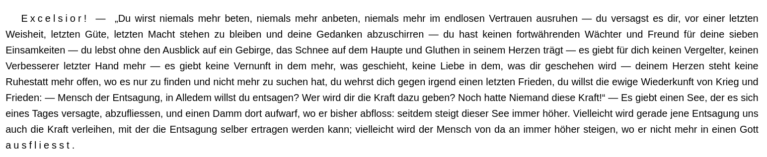 Hier redet kein Fanatiker, hier wird nicht „gepredigt“, hier wird nicht Glauben verlangt: aus einer unendlichen Lichtfülle und Glückstiefe fällt Tropfen für Tropfen, Wort für Wort, — eine zärtliche Langsamkeit ist das tempo dieser Reden. Dergleichen gelangt nur zu den Auserwähltesten; es ist ein Vorrecht ohne Gleichen hier Hörer zu sein; es steht Niemandem frei, für Zarathustra Ohren zu haben… Ist Zarathustra mit Alledem nicht ein Verführer?… Aber was sagt er doch selbst, als er zum ersten Male wieder in seine Einsamkeit zurückkehrt? Genau das Gegentheil von dem, was irgend ein „Weiser“, „Heiliger“, „Welt-Erlöser“ und andrer décadent in einem solchen Falle sagen würde… Er redet nicht nur anders, er ist auch anders…