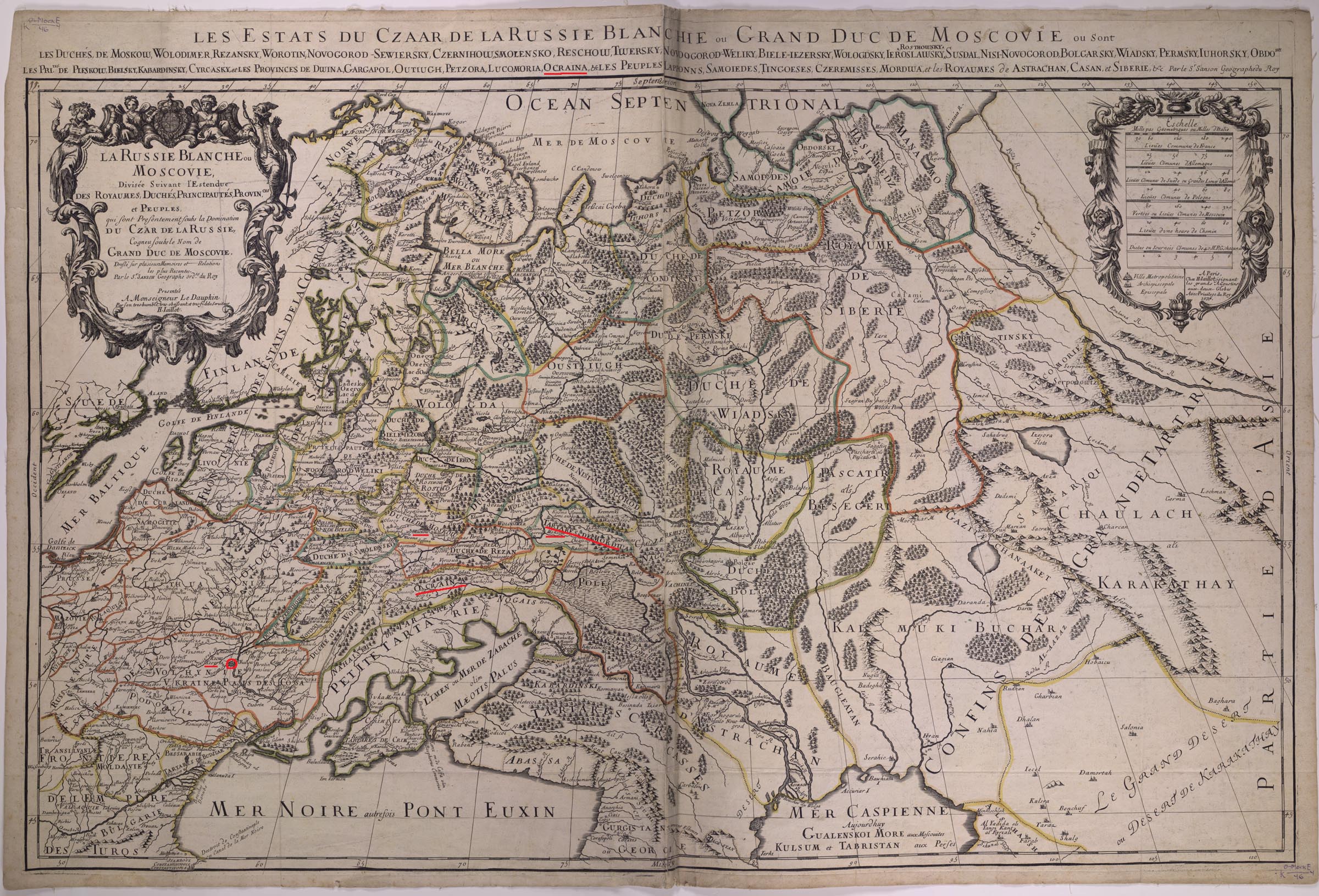 Вот карта La Russie Blanche ou Moscovie divisée suivant l’Estendue des Royaumes, Duchés, Principautés, Provinces et peoples qui sont presentement soubs la domination du Czar de la Russie cogneu soubs le nom de Grand Duc de Moscovie / Dressé sur plusieurs memoires et relations les plus recentes par le S-r Sanson Geogrape ordre du Roy : Presentée à Monseigneur le Dauphin par son tres humble, tres obeissant et tres fidele serviteur H. Jaillot – A Paris : chez H. Jaillot, 1674.