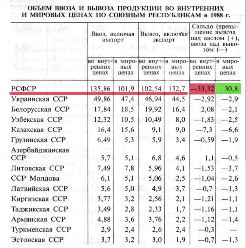 Главная манипуляция срынь заключалась в том, в каких ценах (внутренних или мировых) считать товарооборот между республиками СССР и внешним миром. Если, считать в рублях и внутренних ценах, то сальдо РСФСР было сильно отрицательным, а если в мировых, то положительным (см. табл.1) Ссылка: https://istmat.org/files/uploads/35021/sbornik_statisticheskih_materialov_1990.pdf