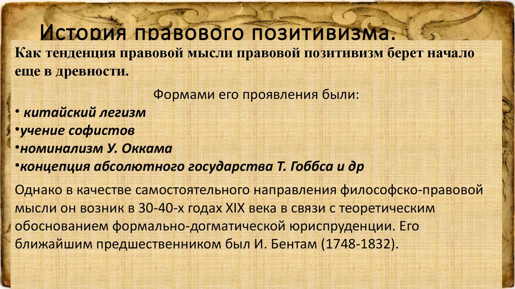 Правовой позитивизм(разумизм) — это подход к пониманию права как системы норм, установленных властью. Право - приказ власти поддержанный санкцией принуждения. Право есть то, что предписано суверенной властью и облечено в форму закона. "Высшие ценности", такие как свобода, не являются необходимыми критериями для определения того, что является "правом" в следствии своей необъективности. Право никому и ничего не должно, оно просто есть как форма отношений.