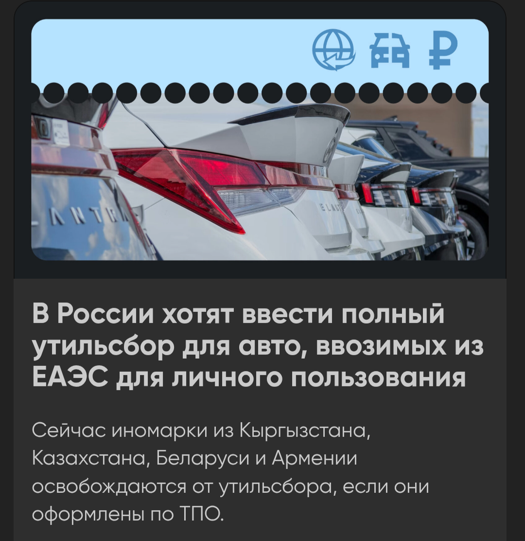 Минпромторг России предложил ввести полный утильсбор для автомобилей, ввозимых физлицами из ЕАЭС для личного пользования. Соответствующие изменения могут внести в постановление, которое регулирует правила расчёта утильсбора при ввозе иномарок в Россию.