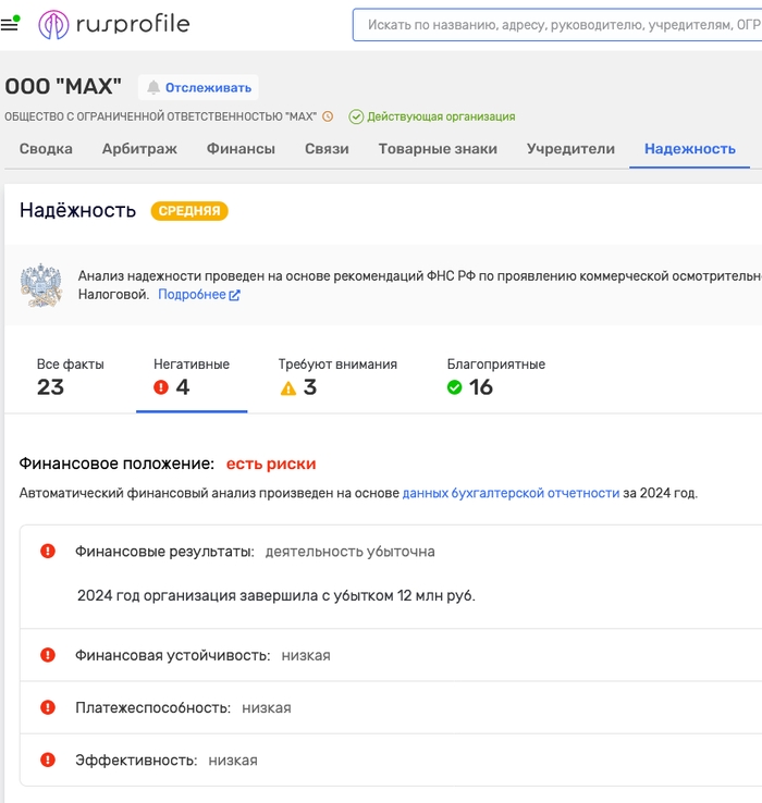 Привет, дорогие подписчики и все читающие этот пост! Меня зовут Илья, я инженер строительного контроля и специалист по обследованию зданий и сооружений. Много лет пишу здесь о своей работе, часть которой - аудит строительной документации и проверка подрядчика на благонадёжность. В связи с шумихой, поднятой вокруг мессенджера МАХ и замедления Telegram, который является основным каналом коммуникации с заказчиками как у меня лично, так и у компании, где работаю штатно, я решил рассмотреть возможность перехода на МАХ. Как обычно, перед началом сотрудничества, я проверяю любую компанию на благонадёжность. МАХ не стал исключением и честно говоря, результаты меня шокировали. Давайте посмотрим на этот мессенджер повнимательней. Проверим его уровень надёжности. Для проверки я буду использовать сервис проверки контрагентов Rusprofile - это довольно популярный ресурс, одобренный налоговой для соблюдения должной осмотрительности при заключении сделок. ИНН нашего партнёра я беру из пользовательского соглашения с сайта мессенджера. Там же я с удивлением узнаю, что мессенджер называется не МАКС. Т.к. согласно законодательству РФ использование в написании названий иностранного алфавита запрещено, можно сделать вывод, что разработчиком является ООО "МАХ". Соответственно и мессенджер называется "Мах". Короче, непонятно, почему Мах до сих пор не устранил эту непонятку одним махом и продолжает называть себя Максом. Это явное введение пользователей в заблуждение. ИНН 9714058267 принадлежащий разработчикам выдаёт следующую информацию: 4 негативных фактора, в числе которых низкая платежеспособность и убыток по деятельности за 2024 год вызывают большие вопросы. Особенно учитывая, что у компании два учредителя, оба юрлица. Среди которых ООО "ВК", которое внесло ни много, ни мало, а почти 100 млн рублей в уставной капитал. Посмотреть самостоятельно можно тут https://www.rusprofile.ru/id/1247700595230 Ещё больше вопросов вызывает присутствие второго учредителя, ООО "Компания ВК", директор которой Багудина Елена Геннадьевна имеет признаки массового руководителя. Таких мы, когда я работал в бизнес-консалтинге, называли "владелец заводов, машин, пароходов." Примечательно, что все компании, находящиеся под управлением Елены Геннадьевны, убыточны и имеют огромное количество судебных процессов. Но нам интересна ООО "Компания ВК", ведь она является соучредителем ООО Мах, которое заМАХнулось на роль отечественного мессенджера номер один и всячески лоббируется правительством, в т.ч. и внедрением привязки к госуслугам. Посмотрим тут https://www.rusprofile.ru/id/724776 И тут уж совсем всё грустно. Выяснилось, что ООО "Компания ВК" недавно проиграло арбитраж на немаленькую сумму, пройдя все этапы отрицание, гнев, торг, принятие апелляцию, кассацию. В принципе, остался только Верховный суд, но как я понял, шансов не заплатить - нет. Кому интересно - может поискать на сайте арбитражного суда, там целая эпопея с чередой фирм-прокладок, в которой суду удалось-таки разобраться и найти должника. Дело № А40-63394/2023 от 27.03.2023. Решением Арбитражного суда города Москвы от 15 июля 2025 года исковые требования удовлетворены частично; взыскано с ООО «Компания ВК» в пользу АО «УК «Первая» убытки в размере 1 129 123,48 долларов США, включая, реальный ущерб в размере 99 125 долларов США, неполученный доход (упущенная выгода) в размере 1 029 998,48 до