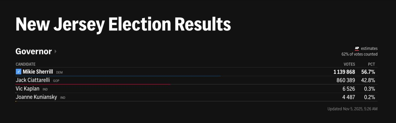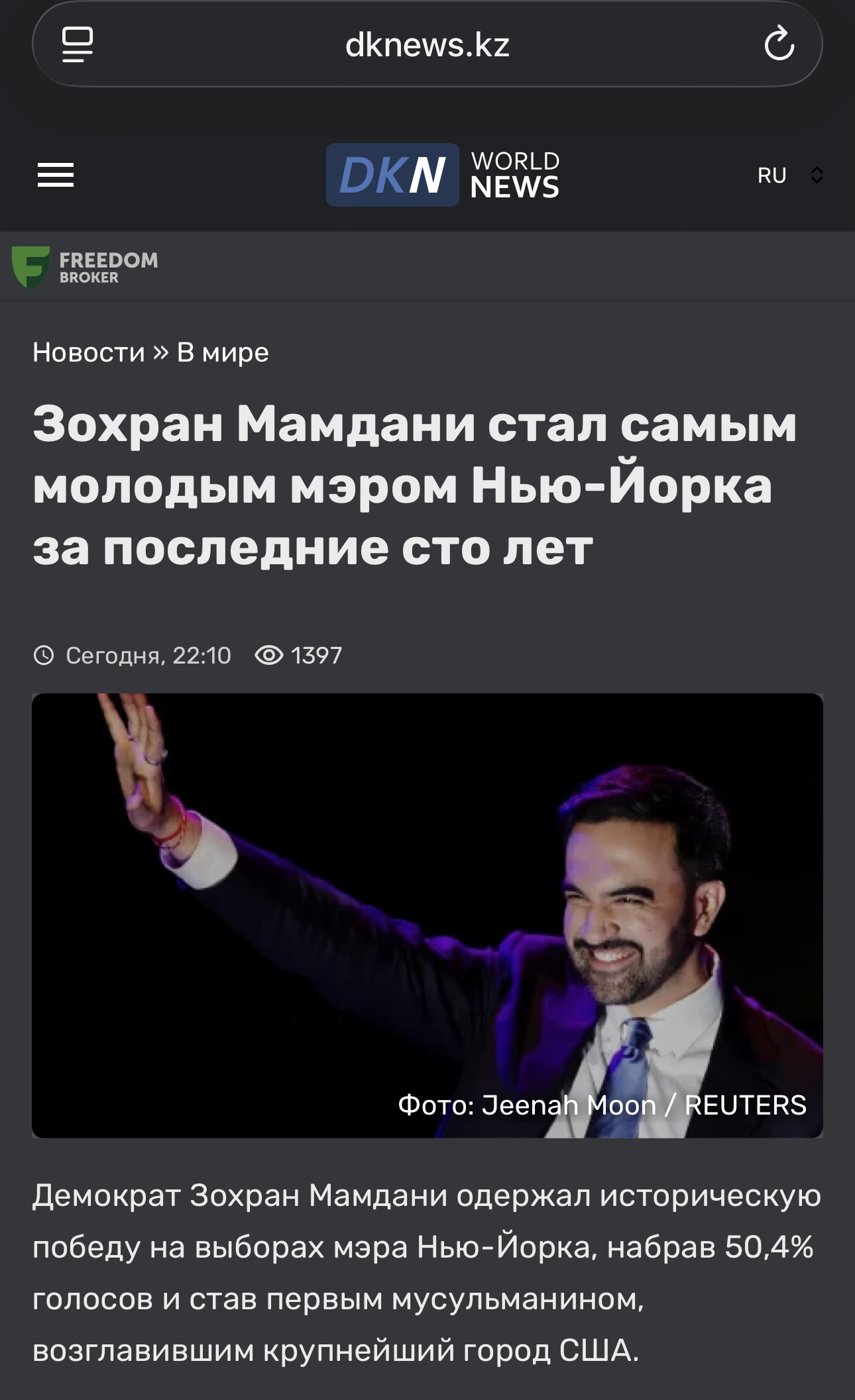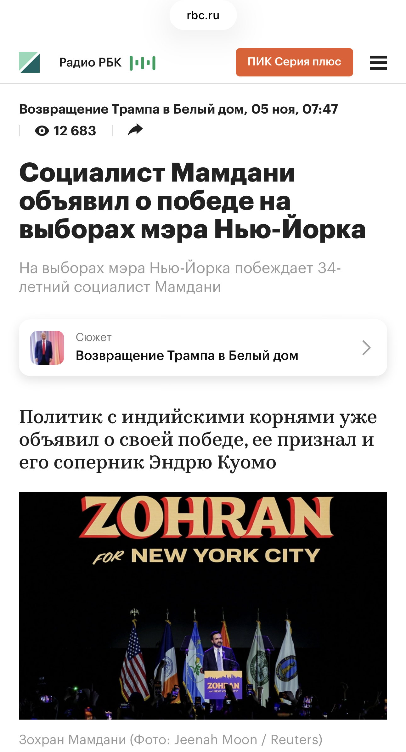 >На выборах мэра Нью-Йорка побеждает 34-летний Зохран Мамдани — кандидат от Демократической партии, уроженец Уганды. Согласно промежуточным результатам, демократу отданы около 50,4% голосов избирателей. Он опережает бывшего губернатора Эндрю Куомо (41,6% голосов) и республиканца Кертиса Сливу (7,1%).