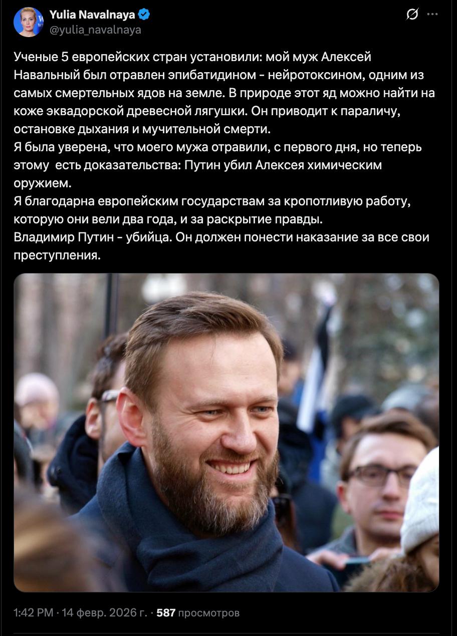 Цитата: «Ученые пяти европейских стран установили: мой муж Алексей Навальный был отравлен эпибатидином — нейротоксином, одним из самых смертельных ядов на земле. В природе этот яд можно найти на коже эквадорской древесной лягушки. Он приводит к параличу, остановке дыхания и мучительной смерти. Я была уверена, что моего мужа отравили, с первого дня, но теперь этому есть доказательства: Путин убил Алексея химическим оружием», — написала Навальная в X, поблагодарив европейские государства за кропотливую работу, которую они вели два года, и за раскрытие правды.