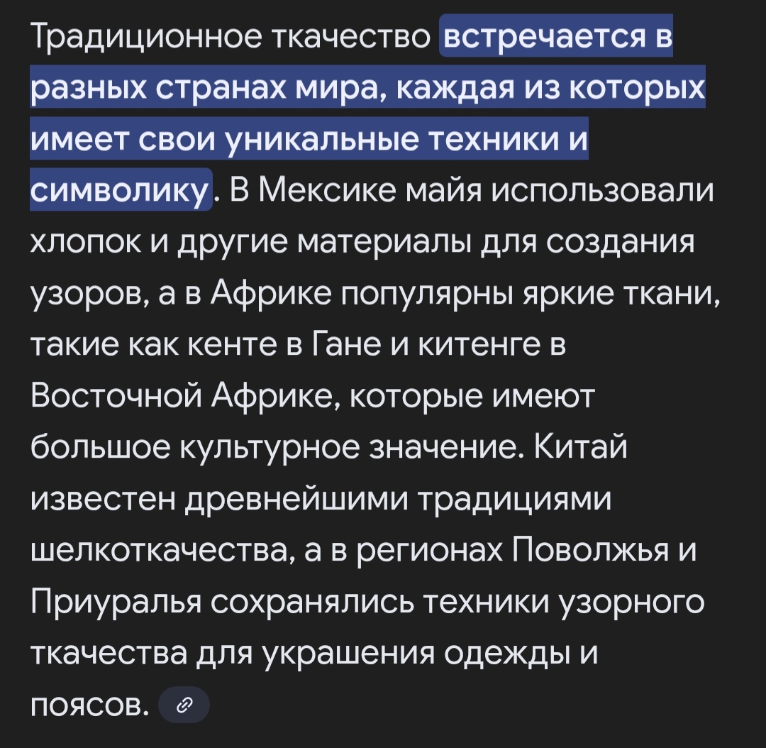>Традиционное ткачество существует с давних времён только у тебя за щекой мудлан. ткачество это сложнейшая система. ты просто не понимаешь что для того чтобы делать ткань нужны гигантские поля, нужно постоянно обеспечивать безопасность и култивацию растений, нужно просто гигантские перерабатывающие комплексы и тд. это раз. во вторых каким хуем что-либо мог создать ткацкие станки шизоид? ткацкий станок по уровню устройства примерно такой же сложные как конпуктер. какие бы ещё чурки создали бы такой станок если верх их изобретательности остановился на ёбаной тяпке? во первых чтобы создать ткацкий станок нужна ткань. ткань они произвести не смогли бы так как им она нахуй не нужна была так как они даже не знали что её можно производить из растений. вот и всё. они ходили в шкурах и думали что так и надо.