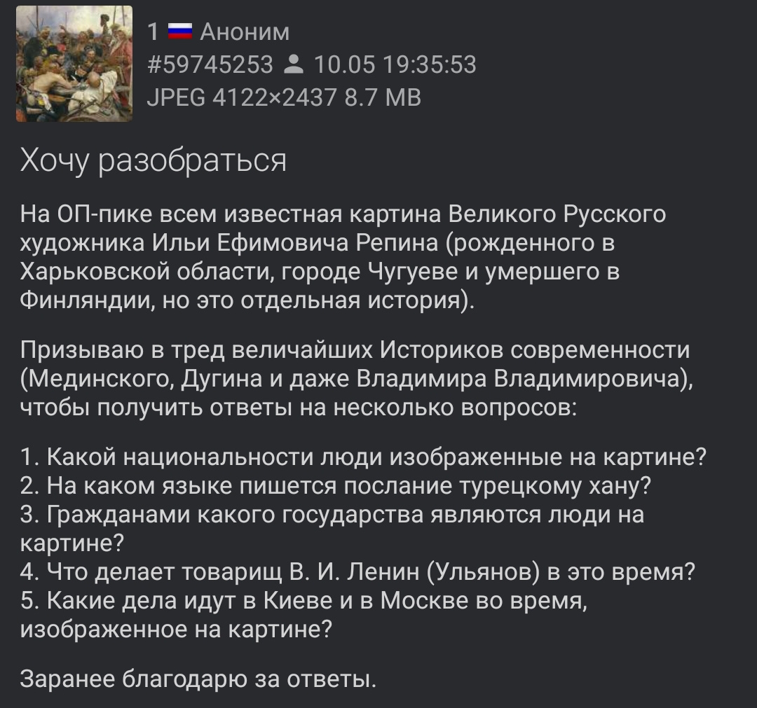 хуй сидящий справа от писаря, тот который в чёрной папахе. он похож на агента внедрённого в "казаки" который следит чтобы долбаёбы всё делали так как нужно закулисе. желтый цвет его одежды символизирует то что он агент и лжёт с целью ввести в заблуждение "казачков-простачков". на него кстати смотрит волк. этот волк символизирует "волчью" натуру замысла. то есть замысле такое коварный безжалостный. волк символизирует загон добычи, охоту, безжалостность и тд.