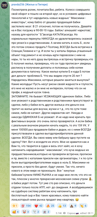 >>61123645 > Ждем в объявлениях на продажу НЕБАБКА Сейчас пишут "один взрослый собственник", что было плюсом для скорости оформления, а теперь получается выгоднее если среди прописанных есть ребенок, пока там органы опеки и роно проверят не нарушаются ли права несовершеннолетнего, пока его выпишут/пропишут в другое место - пройдет куча времени как минимум 2 недели. Старухи же продают быстро и втайне от родни.