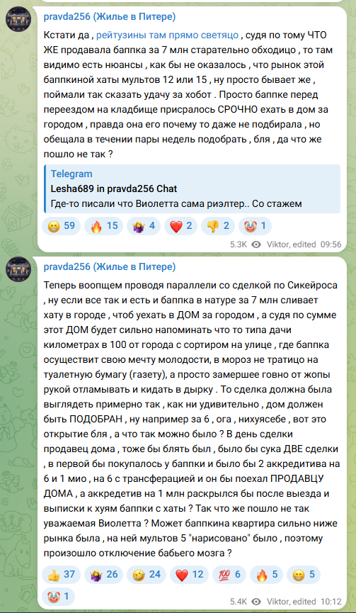 >>61127348 Бабки-пенсионерки очень инициативные и штурмуют всякие администрации и заябывают местные сми своими слезливыми история. Человек с калашом он на фронте, он помрёт через неделю или две после штурма лесопосадки и коммуникации с внешним миром у него минимальные, на крайняк, если будет выёбываться посадят куда надо. У нас очень любят помогать всяким ветеранам, дедам, бабкам и прочих инвалидов, чтобы показать вот мы заботимся о самой незащищенной части общества. Принесут шоколадку, подарят дешёвое полотенце или пачку чая, сделают фотоотчёт, ну вот смотрите какие мы хорошие. А тут даже из бюджета тратить ничего не нужно, за всё заплатит покупаха. В противном случае государство вынуждено будет искать и выделять им комнату, создавать приюты для бездомных. Бабка пойдёт на какой-нибудь Первый канал и завопит, что её без всего оставили, потом сверху пойдут указания свыше разобраться с этой бабкой, устроить её куда полагается, а всё можно было сделать ешё на стадии решения суда. Ну так и сделали. >>61127425 > цена на 10% ниже И чё? Покупатель любую цену может предложить. И десять процентов это не два раза ниже рыночной стоимости >в суд бегут плачут Так это бабка бежит, а не покупатель.