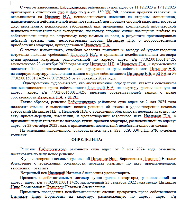 Городской суд и апелляционная инстанция заняли сторону покупательницы: квартира - ее. Ведь сделка оформлена по всем правилам, а проведенная судебная психолого-психиатрическая экспертиза показала, что продавщица вменяема и «старческими отклонениями» не страдает.