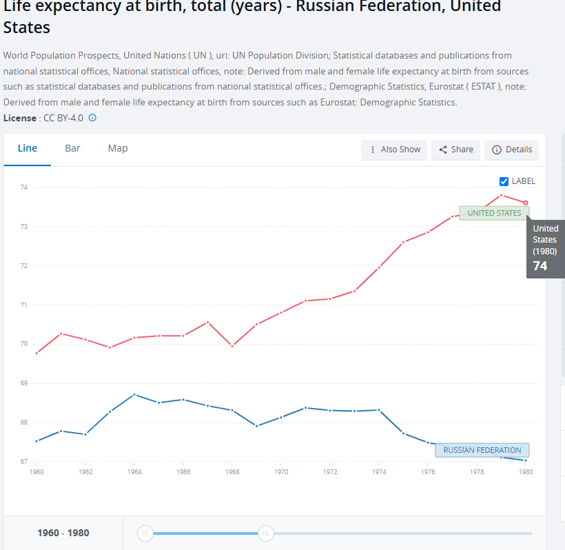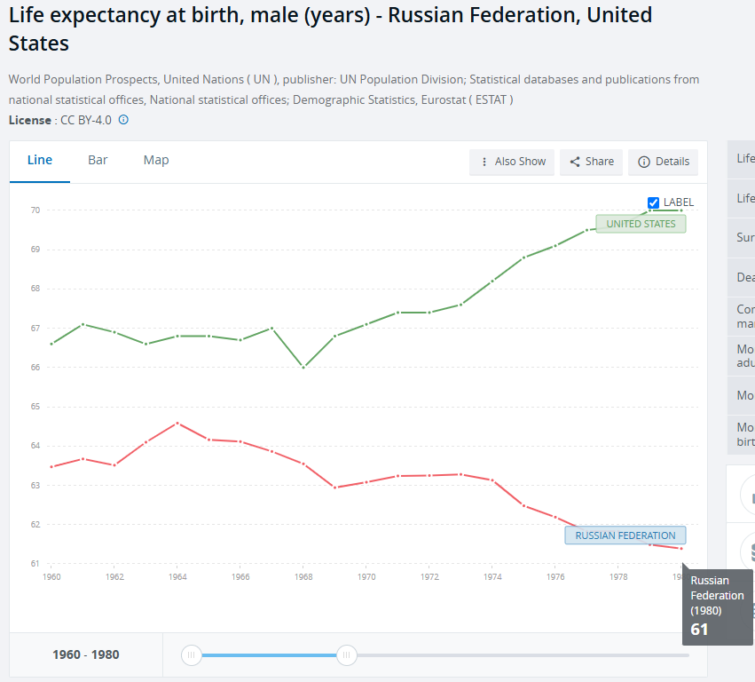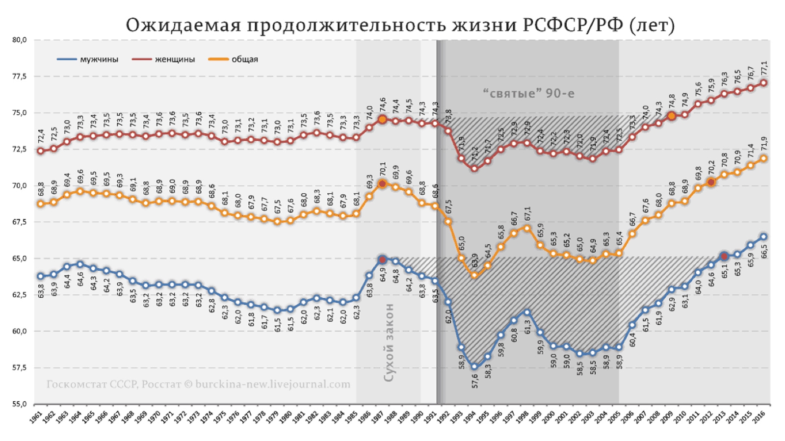 >>61124414 (OP) >средняя продолжительность жизни мужчины в РСФСР - 63 года И падала с каждым годом после 1962-го, кроме периода сухого закона. А смертность всех видов точно также росла, кроме периода сухого закона.