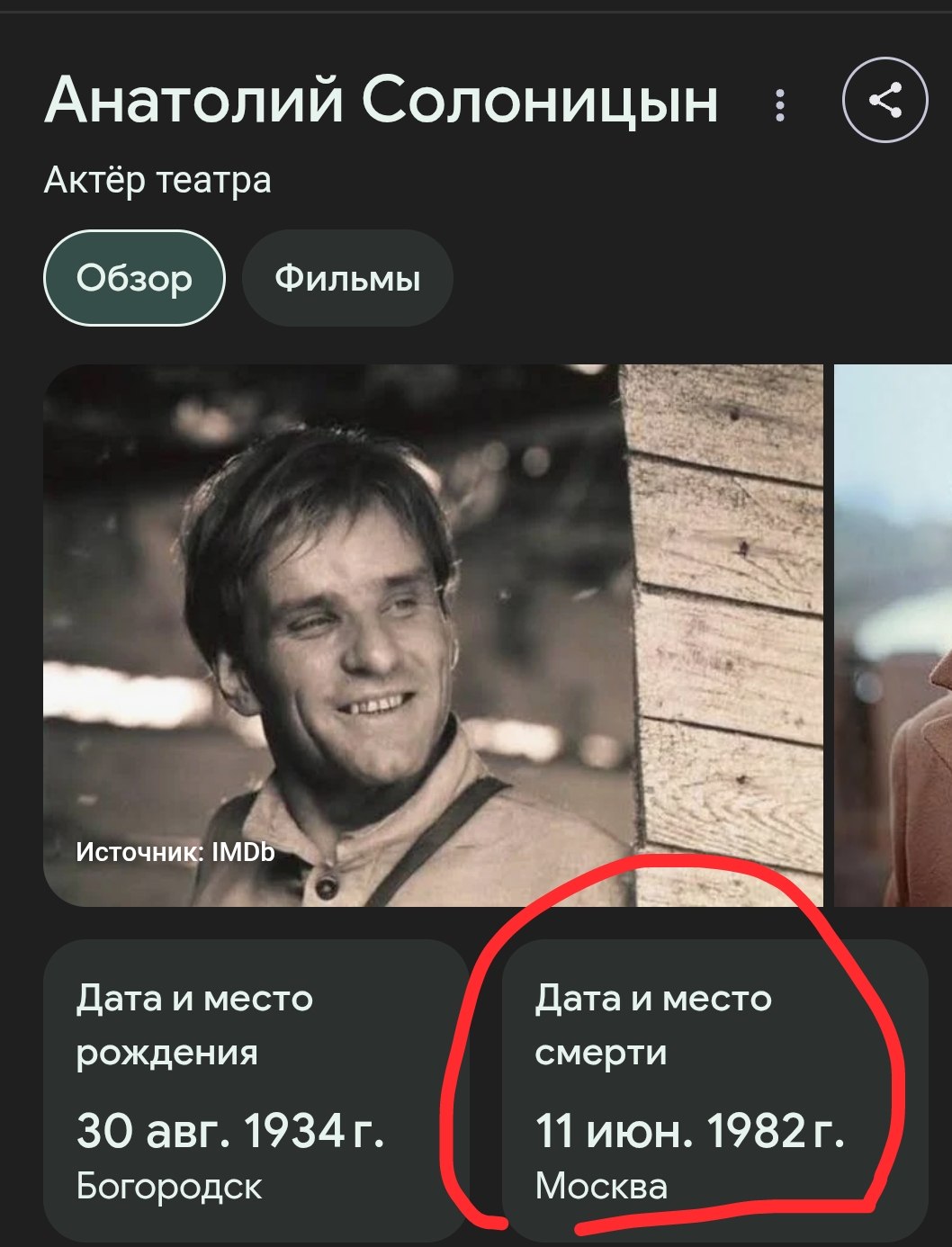 >>61126324 Была проведена операция по удалению части лёгкого. Больному о диагнозе решили не сообщать. Через год на съёмках в Белоруссии Анатолию Солоницыну стало плохо. Актёра срочно отправили в Москву в Первый медицинский институт. Врачи обнаружили, что метастазы распространились на позвоночник.[9] Остановить процесс было уже невозможно.
