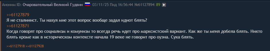 >>61127879 Я не сталинист. Ты нахуя мне этот вопрос вообще задал идиот блять? >>61127871 Когда говорят про социализм и комунизм то всегда речь идет про марксистский вариант. Как же ты меня добела блять. Никто блять кроме как в историческом контексте начала 19 веке не говорит про оуэна. Сука блять.