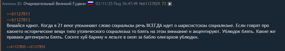 >>61127811 >>61127813 Вешайся идиот. Когда в 21 веке упоминают слово социалмзм речь ВСЕГДА идет о марксистском социализме. Если говрят про какието исторические вещи типо утопического социализма то блять на этом внимание и акцентируют. Ублюдок блять. Какие же праваки дегенераты блять. Сосите хуй барину и лезьте в окоп за бабло олигархов ублюдки.