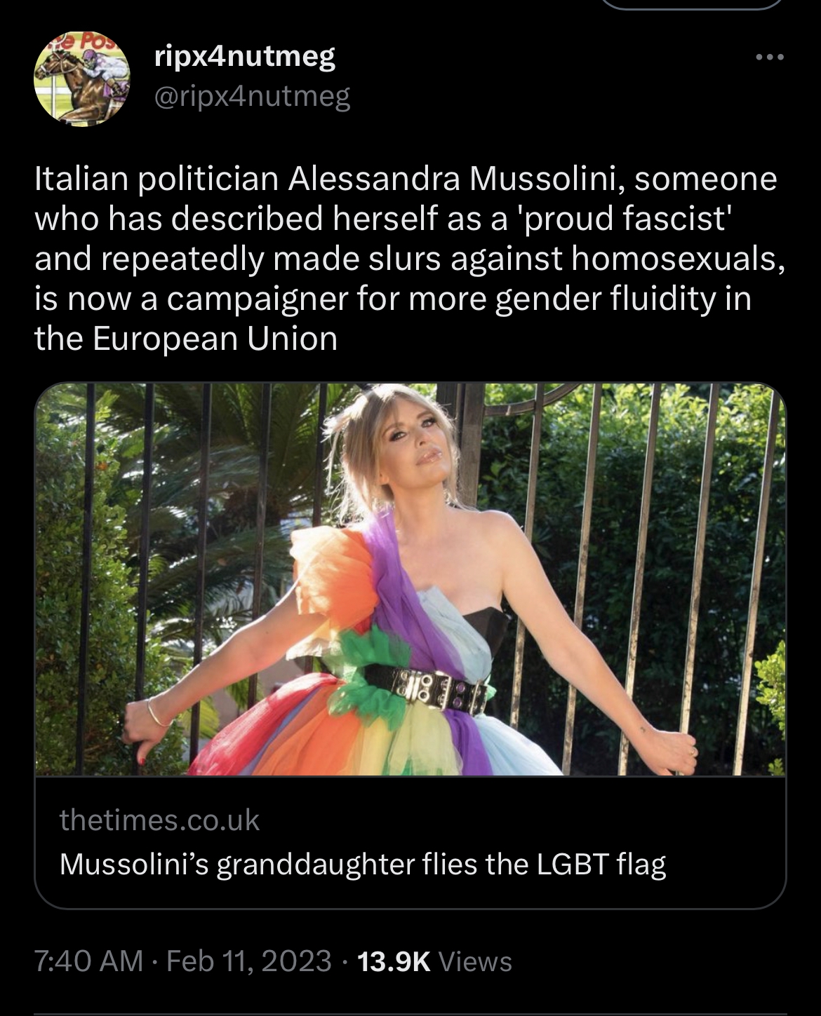 >>61127533 >А кем ещё должен быть национал-социалист? ✅ Гей / Лесбуха ✅ Любит Израиль ✅ Поддерживает нигр и межрасовые браки (Нигры триггерят либералов, а либералы = комми = истинные расисты) ✅ Поднимает традиционные ценности (9000+ базированных гендеров включительно) ✅ Помогает свободному рыночку через завоз 100500 мексов/арабов/чурок ✅ Отрицает любые различия между людьми (в MAGA-кепке все равны)