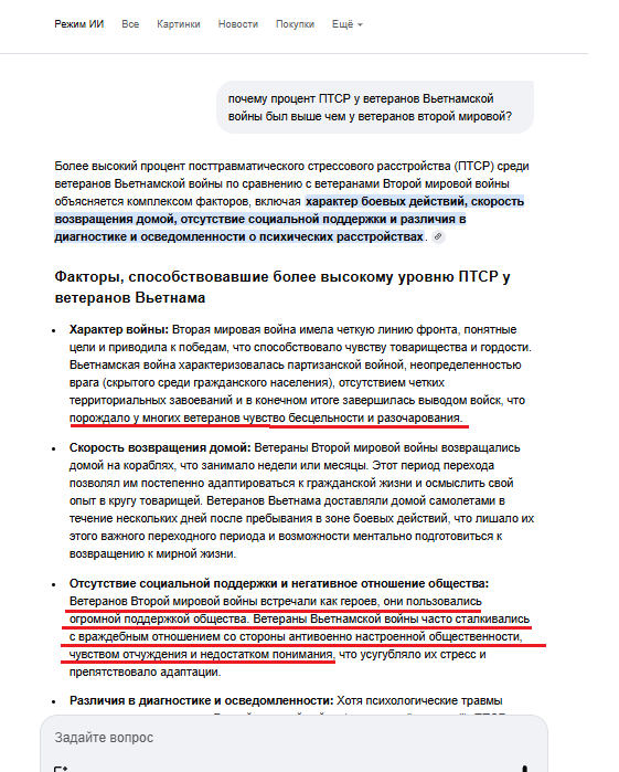 Режим ИИ - сразу нахуй. Спроси его наоборот, "почему процент ПТСР в ВВ2 был больше чем во Вьетнамской" и он тебе так же убедительно раскидает, почему оно так.