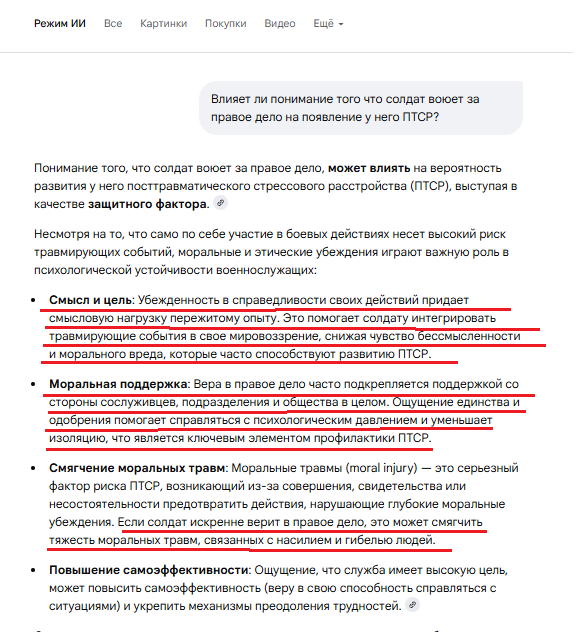 Тебе в твою тупую голову не приходила мысль что если нейросеть говорит что понимание правого дела за которое воюешь влияет на уровень ПТСР у солдат, то это на чем то основано? На статистиках, статьях и опросах которые анализирует нейросеть? >>61140264