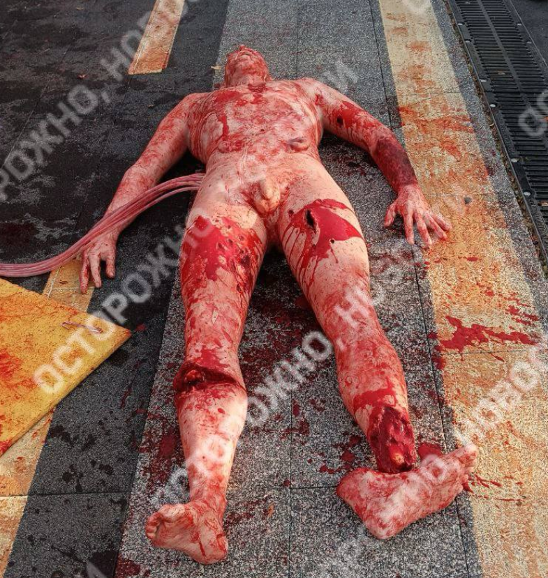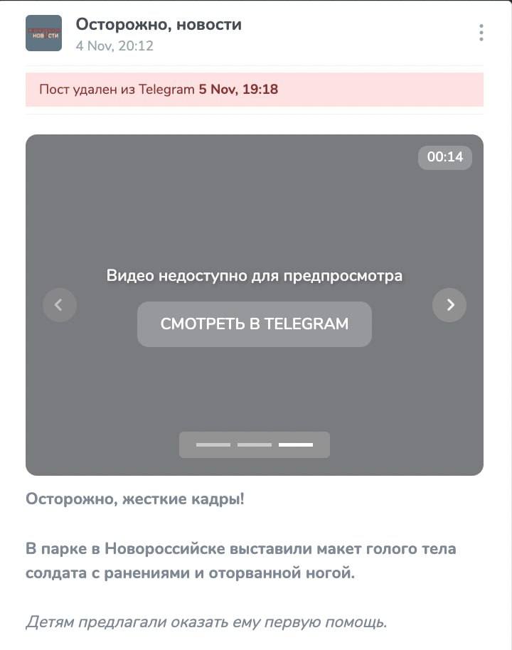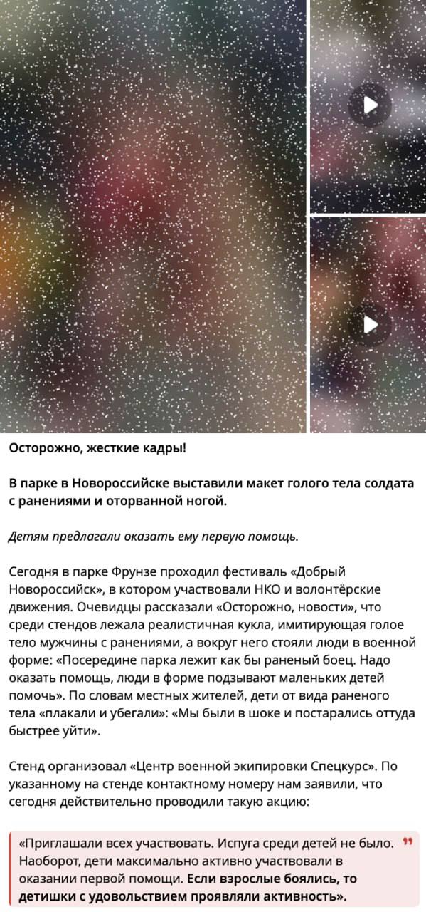 Telegram, предположительно, удалил из "Осторожно, новости" пост о макете голого солдата с ранениями в Новороссийске, на котором обучали детей.