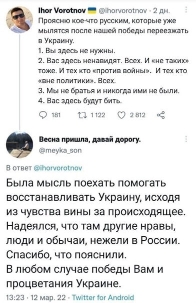 >>61407122 Кто угодно может прямо сейчас сходить в Твиттер или Реддит и воочию понаблюдать что "бедные нищасные украинцы" пишут о русских и чего им желают