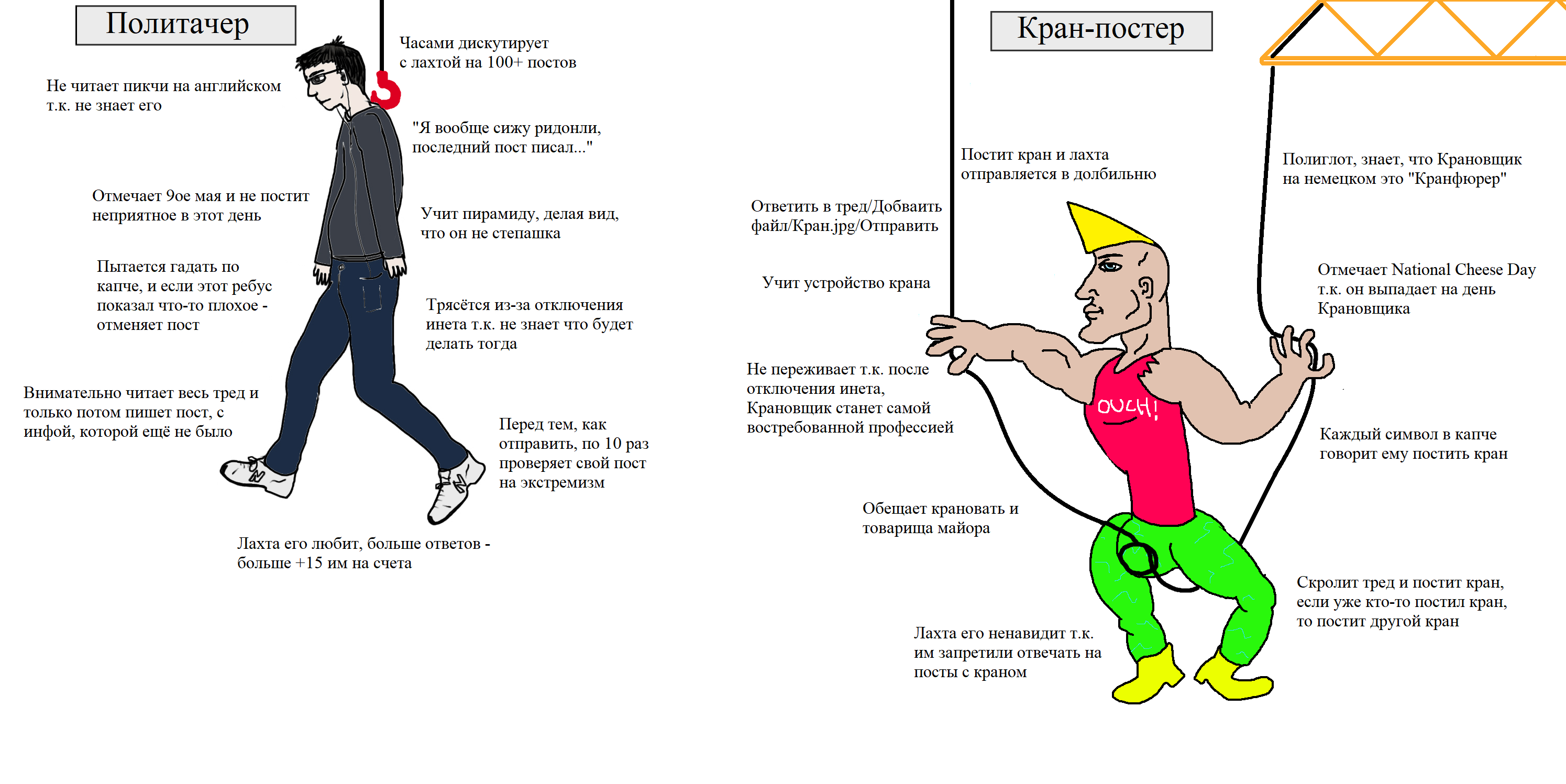 >>61468021 >Откуда вообще эта тема с кранами пошла? Один анон форсил видос, как брата Ассада, не успевшего съебаться, подняли на кране, потом какой-то анон сделал картинку с лахта-центром, потом к ней добавили видос с братом ассада, потом пошло поехало.