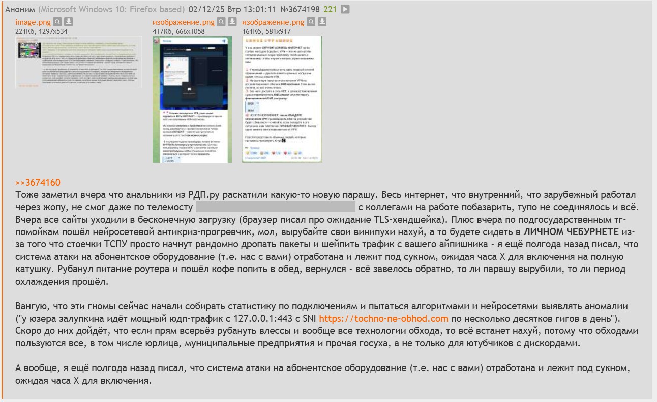 Судя по динамике происходящего, более-менее свободный доступ к зарубежному интернету со всеми "но" и "если" продлится ещё годик-другой, три максимум, после чего все эти влессы, амнезии и прочие валдики из сс накроются медной пиздой из-за комбинированного воздействия на способы обходов - баны протоколов по эвристике + борьба с дробилками пакетов + удаление записей из национального DNS + белые/серые/чёрные списки IP-адресов + накопление статистики по конкретному абоненту с последующим автоматизированным баном хоста обхода ("у юзера залупкина в месяц набегает 500 гб трафика на 359.359.359.359 со SNI tochno-ne-obhod.blyabudu") + навязывание национального сертификата с госMITMом + баны всех мало-мальски пригодных хостинг-провайдеров + бутылки и законы, прямо запрещающие пользоваться обходами + административный ресурс и работа с людьми. Серебряной пули, которая заблокирует всё, действительно нет, и отдельные люди смогут просочиться через все эти заслоны, но таким образом можно будет отсечь подавляющую часть населения включая "прошаренных" (типа скуфиксов из /s).