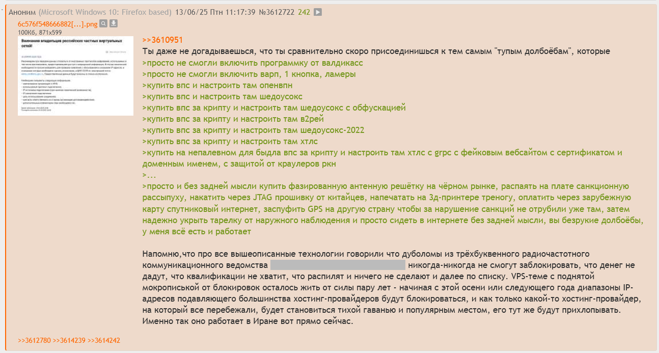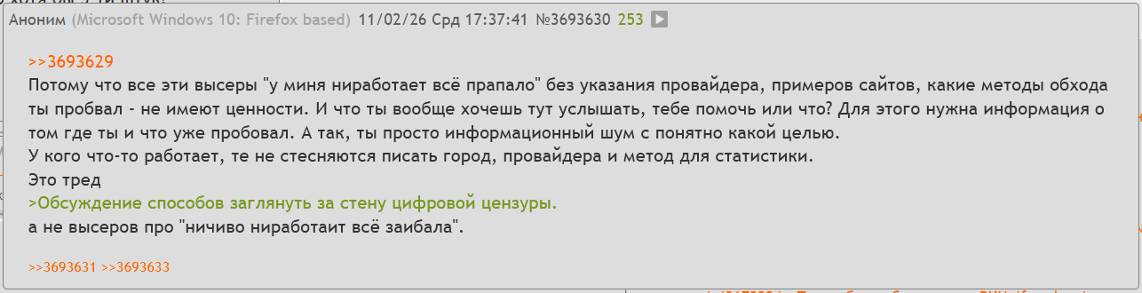 >>61851331 >на дваче мне про способы обхода не говорит, никто тему палить не хочет. Не хотят говорить, потому что в тематических тредах (например, в /s) неиронично сидят сотрудники РКН или их подрядчиков, чтобы набить статистику и получить информацию, чем народ пользуется, плюс мочер откровенно набивает стату по постерам и, видимо, отправляет куда надо. Палятся по "ну вот ты говоришь, что у тебя ничего не работает, а ты назови провайдера и город, сделай tracert curl telnet со своим айпишником и пости результаты".