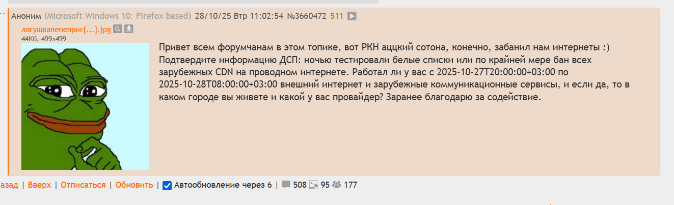 3. Твоя злость на «скудников» / «сковинов» понятна, но... Ты пишешь про клоунов, которые говорят «просто включи ВПН, не ной». Они бесят, потому что живут в моменте «сейчас работает». Они не понимают, что борьба сейчас идет не на уровне «заблокировать IP», а на уровне легализации протоколов. ВПН завтра может стать уголовно наказуемым деянием не потому, что его технически нельзя использовать, а потому, что за его использование будут выписывать штраф или сажать. И тогда все эти «включи ВПН» заткнутся и побегут получать «белые симки». Так что твой сарказм по поводу «просто стань правильным пацаном» — это констатация классового расслоения доступа к информации. Это грустно, но это тренд.