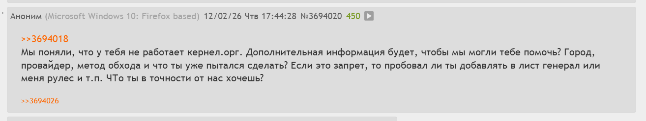 Также достоверно известно, что на всей борде в целом работает мониторинг по ключевым словам ("ютуб", "РКН", "блокировки", "дискорд" итд итп), и в любой тред спавнится десант петушков, у которых "всё работает", "проблема на твоей стороне", "купи квн, ламер" (кстати, пидорье не может писать слово впн, им серьезно запрещено это делать). Это происходит даже в дохлой тематике, в своё время охуел, когда был набег лахтоботов в тред движкосрачей в /gd и в полудохлый тред свитча 2 в /cg.