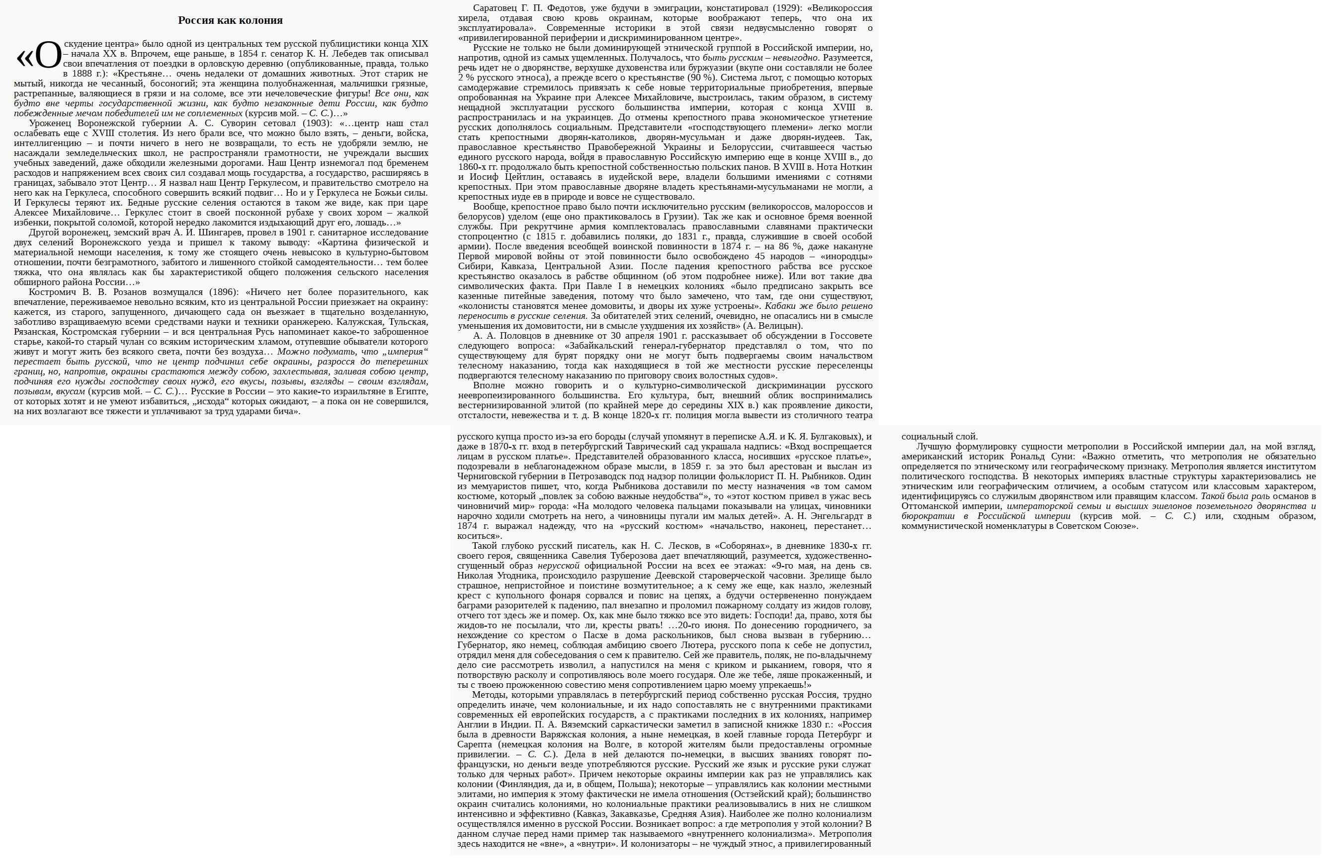 >>61866997 >У Рашки то же самое, колониями выступали центральная Азия, весь Кавказ (и северный, и южный), вся северная азия (сибирь, дальний восток), украина-беларусь, балтия, ну и конечно же сами русские, которых абсолютная монархия выжимала больше всего. Нет, колониями в РИ были только Великороссия (в большей степени), Украина и Беларусь (в меньшей степени) в тех местах, где они были заселены восточными славянами. Всё остальное колониями не было.