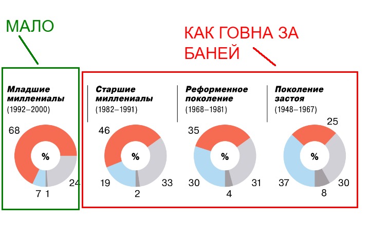 >>61869349 (OP) На твоих графиках от ВЦИОМа все показано. Поколения, которые поддерживают блокировки (и в целом курс на глубоко сидящий чекистский сапог в анусе), самые многочисленные, их как говна за баней. Они и делают львиную долю рейтинга Путина таким высоким. Младшие миллениалы, которыми ВЦИОМ считает всех, кто родился с 1992 по 2000, и поколение цифры (зумеры) 2000+, копротивляются еще как-то блокировкам, но и среди них немало любителей сапога