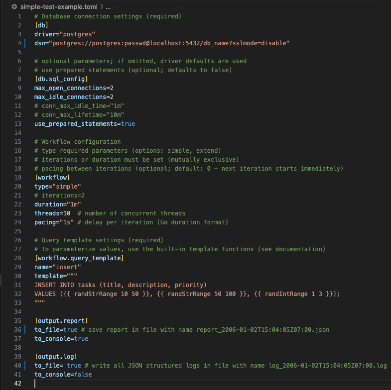 Скоро буду выпускать уже версию проекта v0.0.1 у которого будет следующий функционал: 1. Два СУБД на выбор (mysql, postgresql) 2. Параметризация значений SQL запроса через встроенные функции 3. Возможность выбирать между text query и prepared statement 4. Запись логов stdout и/или в файл 5. Запись отчета stdout и/или в файл 6. Из показателей помимо классических доступны перцентили (50, 90, 95) которые реализованы засчет структуры данных TDigest: github.com/caio/go-tdigest 7. Можно сделать плавный выход на указанную нагрузку 8. Можно писать метрики в influxdb 9. Скрипт пишется в toml файле