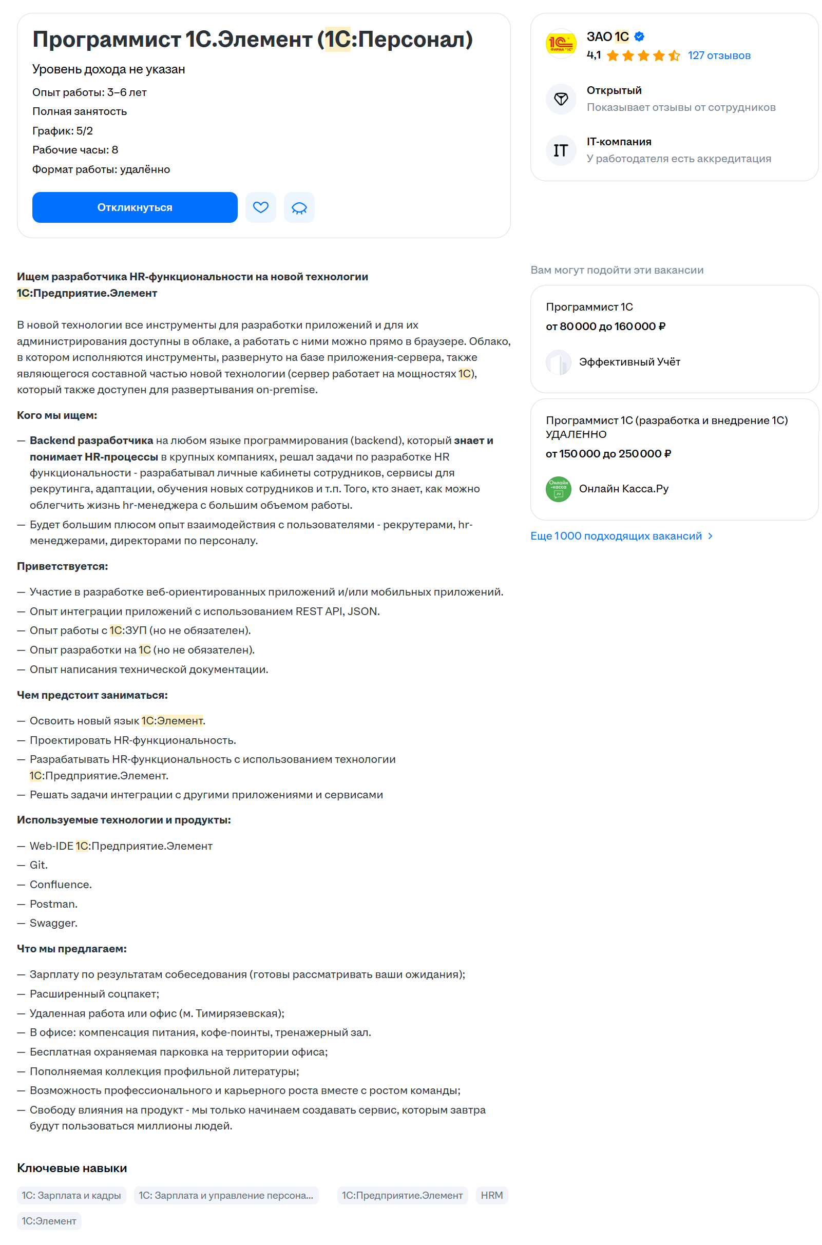 >>3450718 Потому что в сейчас всё что делается на Элементе делается фирмой 1с и её приближенными партнёрами - буквально одной-двумя франчами. Потребности фирмы часто закрываются миграцией программистов с других продуктов - кодеры с условно ерп/бух уходят на Элемент. Как клиенты распробуют Элемент - появятся вакухи на нём. Олсо, на недавней конференции, когда мы заявляли что Элемент вышел из беты, все партнёры были в шоке, что за 70к в год предлагается использование Элемента, без ограничения по количеству подключений. Это сильно должно запустить продажи.