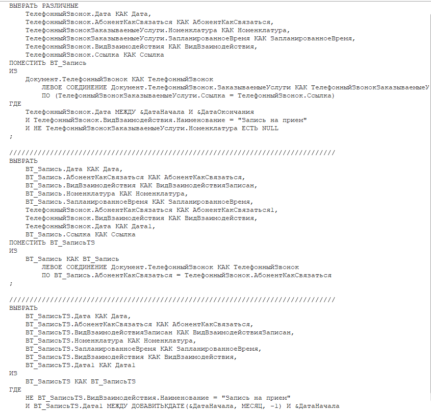ВЫБРАТЬ ВТ_Запись.Дата КАК Дата, ВТ_Запись.АбонентКакСвязаться КАК АбонентКакСвязаться, ВТ_Запись.ВидВзаимодействия КАК ВидВзаимодействияЗаписан, ВТ_Запись.Номенклатура КАК Номенклатура, ВТ_Запись.ЗапланированноеВремя КАК ЗапланированноеВремя, ТелефонныйЗвонок.ВидВзаимодействия КАК ВидВзаимодействия, ТелефонныйЗвонок.Дата КАК Дата1 ИЗ ВТ_Запись КАК ВТ_Запись ЛЕВОЕ СОЕДИНЕНИЕ Документ.ТелефонныйЗвонок КАК ТелефонныйЗвонок ПО ВТ_Запись.АбонентКакСвязаться = ТелефонныйЗвонок.АбонентКакСвязаться //По ссылке не вариант вязать, нужно именно по телефону ГДЕ НЕ ТелефонныйЗвонок.ВидВзаимодействия.Наименование = "Запись" И ТелефонныйЗвонок.Дата МЕЖДУ ДОБАВИТЬКДАТЕ(&ДатаНачала, МЕСЯЦ, -1) И &ДатаНачала