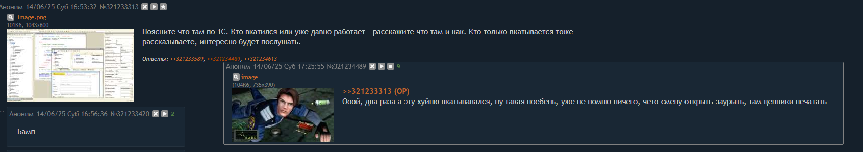 >>3447239 (OP) Всем привет а есть что по интеграции с 1С? Я работаю в другой системе (1С только от Майкрософта, лол) и чаще встает вопрос об интеграции с ней или из-за санкций появляются запросы в духе "а сделайте нам чето такое же чтоб как в 1С". Но чаще просто надо наладить с ней взаимодействие