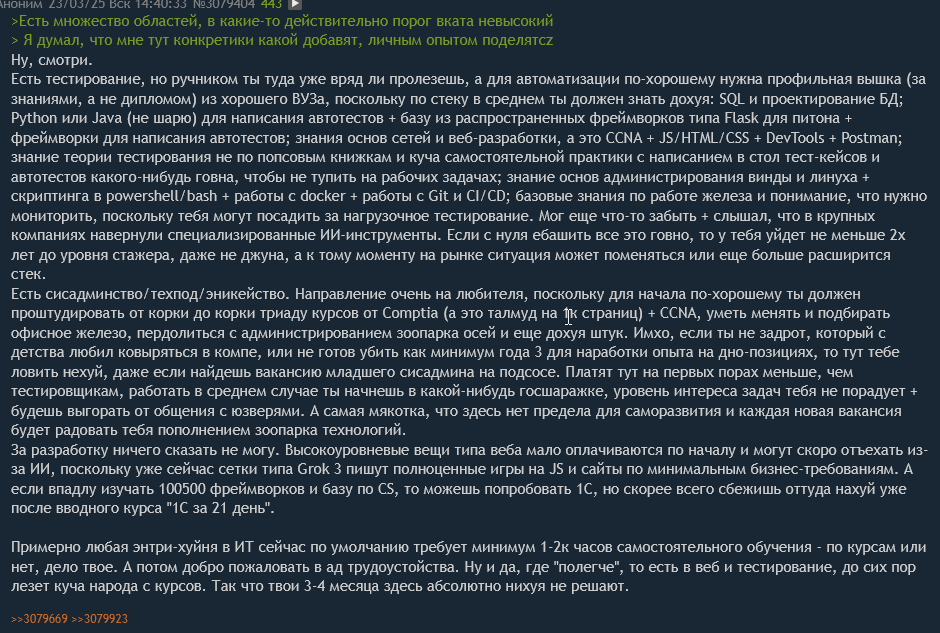 >>3509249 Я и не сказал, что оно само собой пойдет, я как раз расцениваю это возможность стать кем то и делать что то полезное, развиваться не ради развития, а чтобы делать что то ещё более крутое и хорошо за это получать. В куа я достиг потолка - это сеньорская лычка и отсутствие нормальной работы для нее, я тупо продолжаю заниматься той же работой, потому что для чего то свыше этой хуйни никогда нет бюджета ни самого запроса. Да, можно бесконечно выдрачивать теоретические вопросы и осваивать инструменты и подходы - но кому это нахуй надо? Работа один хуй одна и та же, какой проект ты ни возьми, результаты работы не осязаемы, отношение к тебе как ко второму сорту и доп. издержке. В менеджеры идти не хочу, это вообще уже другая работа и мне она не интересна. Так что я хз при чем тут этот проход в инфантильность, будучи qa ты как не трясись будешь именно низкоквалифицированным персоналом в лице всей команды, даже на позиции qa-архитектора с навыком пиздеть с важным видом и собирать бесполезные метрики.