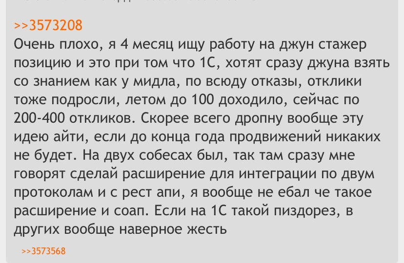 >>3536005 >3000-5000 вакансий что мешает? бота делаешь и вперед. или скрипт какой. а на деле что не так? больше вакансий, больше шанса что возьмут. у меня знакомый откликнулся когда искал работу на 700шт. воронка же, разве нет? >в тиндере проще всего знакомиться, потому что там больше всего женщин от части да. так и есть. > Вакансий golang программеров всего штук 800 их на самом деле больше примерно раза в 2. просто никто на хх не публикует, потому что там найм максимально хуевый. сначала очень тщательно ищут по своим и по партнеркам всяким. или смотрят хх, видят норм кандидата, и ему описание вакансии. >А ты через 10 лет будешь всё также за 100к/месяц небо коптить, потому что тебе влом было рисковать минусы? кто хочет рисковать? 100к это зп джуна в 1с, ты о чем. >>3536106 кстати нахожу забавным, что анон сравнил количество вакансий, и не сравнил саму динамику рабочего процесса. то есть в то время как инженер спокойно окукливается в своем мирке, программист 1с будет общаться и общаться много. хотя конечно разраб 1с разрабу 1с, но вот общался со знакомым, по 14ч созвонов в неделю. и все важные.