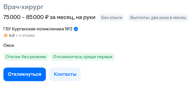 Вот я тебе откопал вилку в сраную омскую поликлинику, то есть это даже не больничка, а амбулаторная хуйня и зепка уже близка к сотке. Оперирующий в больничке врач будет еще раза в 2 больше получать, не говоря уже о том что у них помимо белой зп есть еще и платные приемы где они долутывают до нормальны сумм которые айти блядям в той же перди никогда и не снились, если в этих пердях на местном рыночке вообще айтишники есть кроме удаленочных демпингующих червей