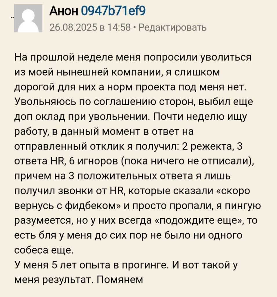 >5 трлн дефицита бюджета >новый виток эскалации >западный рынок закрыт >рост налогов на ИТ на треть >300-500+ откликов на каждую ИТ вакансию, такого никогда не было >LLM >движение волчат с сотнями тысяч просмотров >засилье рекламы ИТ курсов как билет в счаствую жизнь >сотни тысяч выпускников ИТ вузов ежегодно выбрасываются на рынок труда >на хабре традиционные статьи про выкат из ИТ в ХХХ профессию >продолжать верить что ИТ не всё