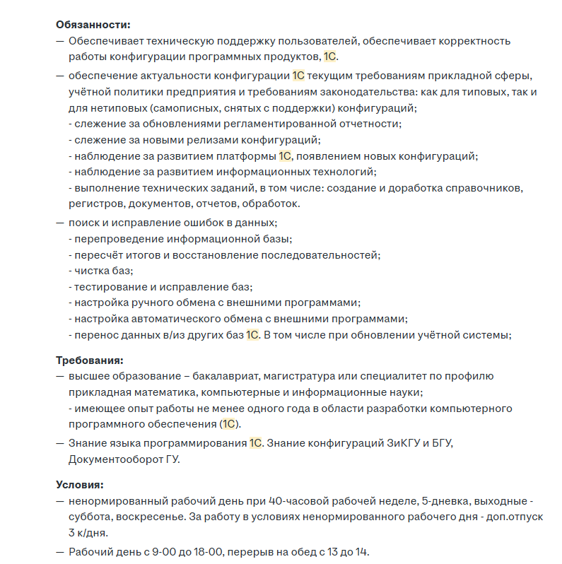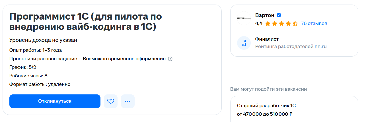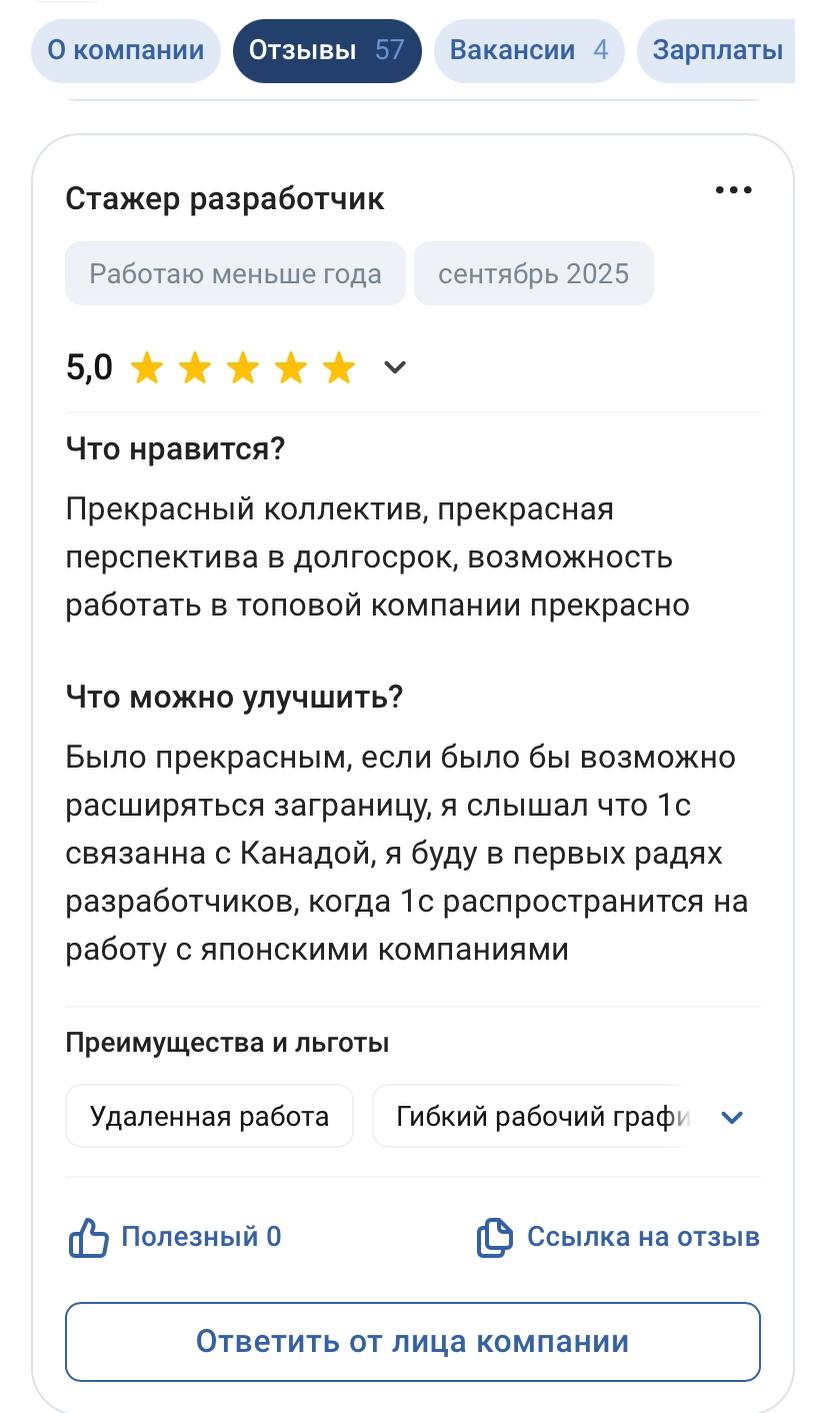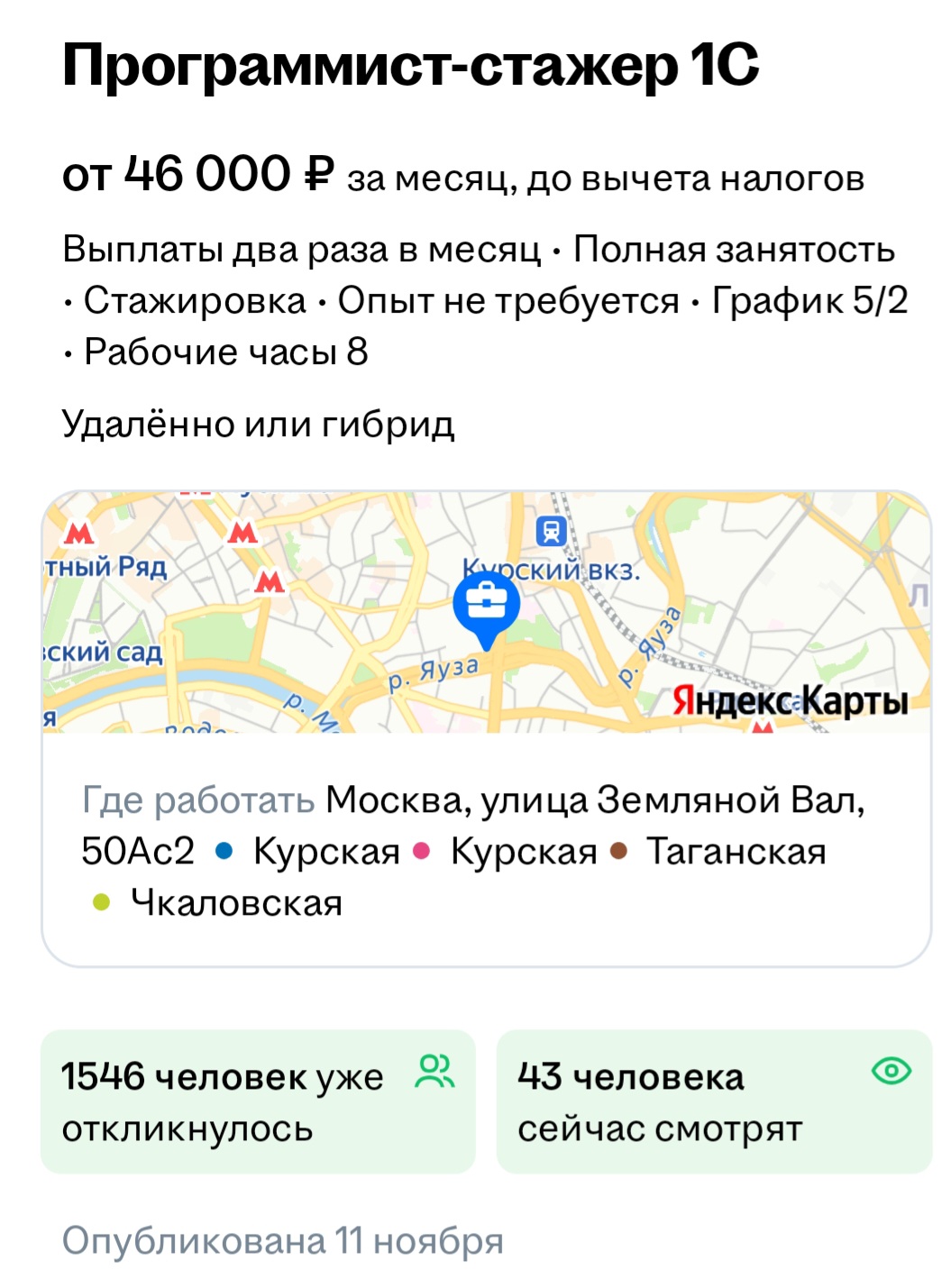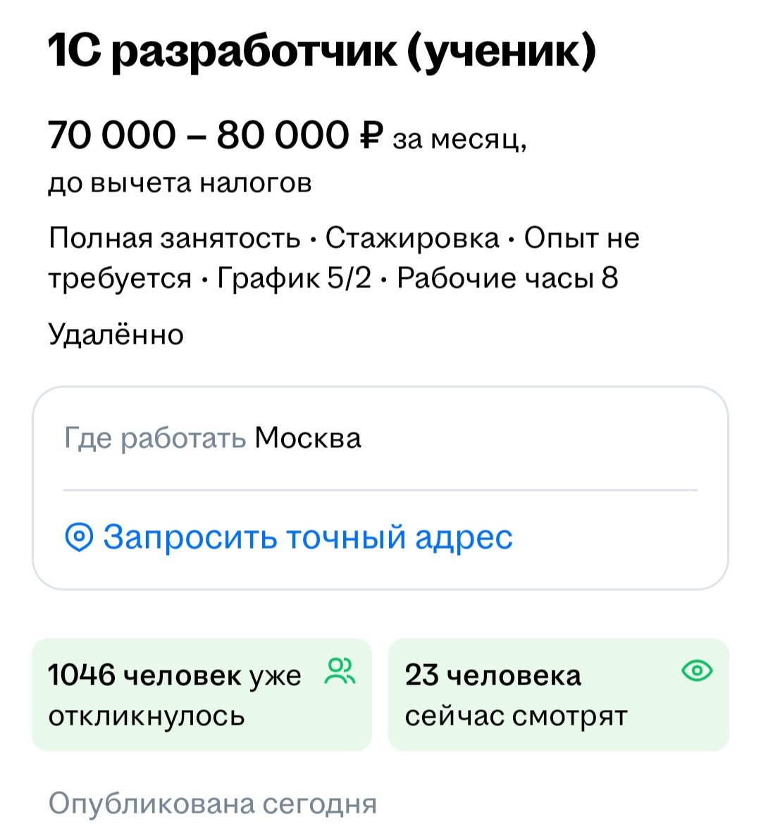 Вкат в 1С закрыт. Шансов ноль. На стажёра 4к откликов, на джуна 1к откликов, на мидла по 200-300, на синьку по 100-300, на откровенную хуиту с тонной обязанностей и зп 100к по 20-50 откликов, но проще уж в калцентр пойти, там ваще ничо знать не надо и плотют 50-60к.