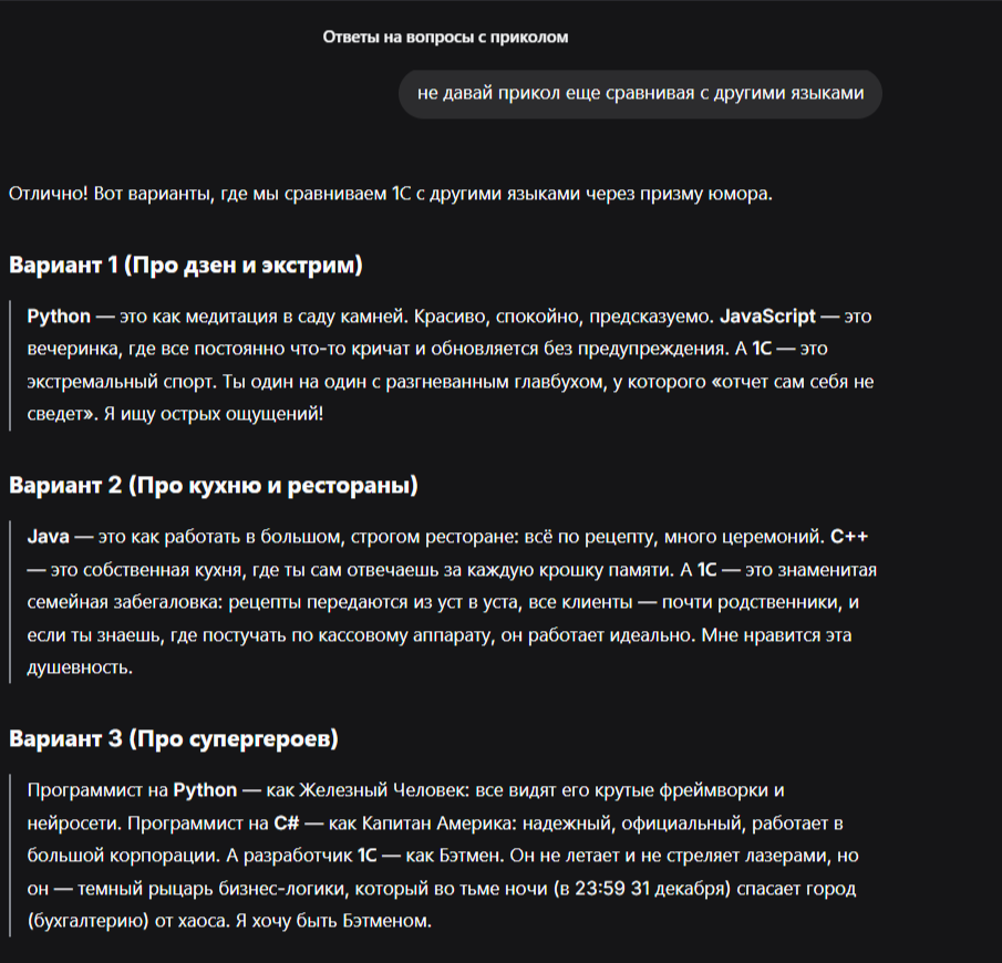 Сегодня Дрисьсик выдал мне, что у метаданных есть метод ТаблицаДанных, который и используется для того, чтобы определить таблицу по ссылке объекта. Когда я ему сказал, что он пиздабол и такого метода нет, то сия крутая ЫЫ немедленно согласилась и убрала неправильный ответ из выдачи. Какая ж потешная хуйня, пока вкатуны на этом говне обучаются, можно не заботится насчет конкуренции.