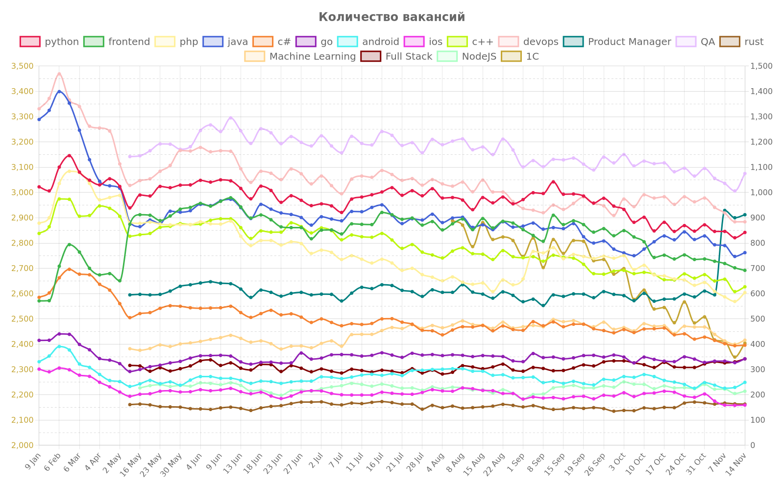 Но почему? Кажется, что в экономике дела хуёво, поэтому так оно и происходит. А почти всё отечественное на 1С, даже самый малый бизнес, поэтому видим такой спад. В то время как остальные языки почти не упали. Потому что работают на заморского барина? Вряд ли. Может потому что часть специалистов съебали, открыв тем самым часть вакансий. Проиграл, кстати, как рухнули вакухи в 02.2022. По этой диаграмме потомки могут определять состояние страны в целом.