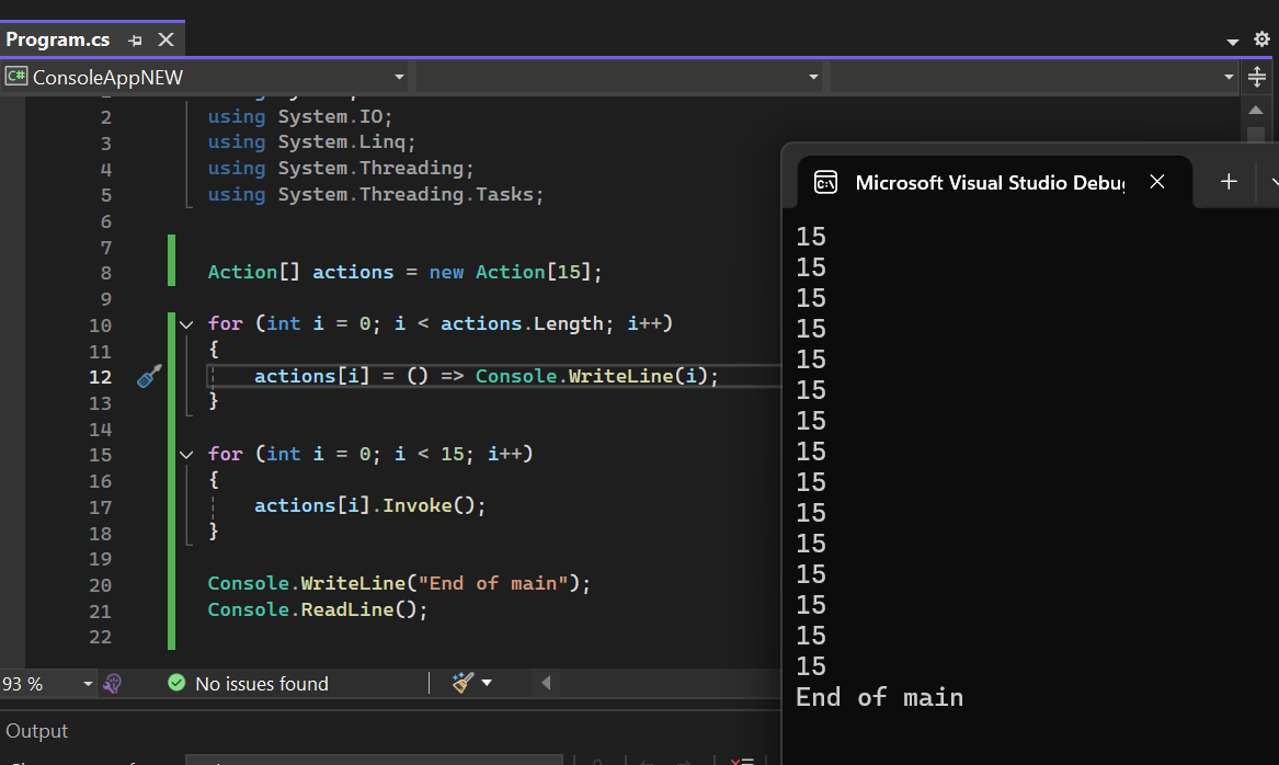 Если вкратце, то в Console.Writeline в качестве параметра i попадает значение из первого цикла, а не второго. А с учетом того, что когда ты дергаешь экшены, первый цикл закончился и i в нем равен 15, то ты и получаешь такой результат.