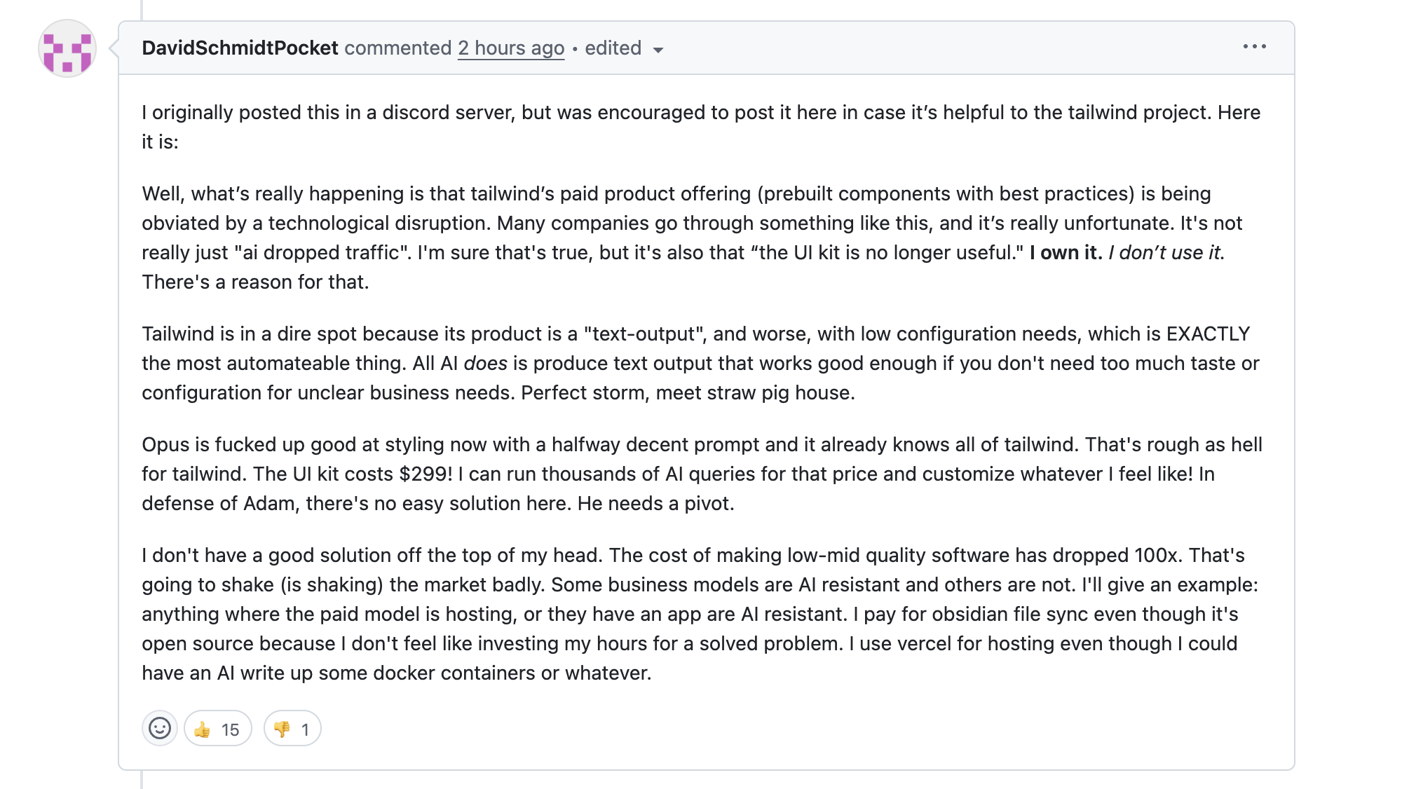 2) Чтобы купить эту самую подписку надо зайти на сам сайт с доками этого tailwind CSS и нажать на кнопочку оплатить. В эпоху вайбкодинга на сайт перестали заходить, потому что а нахуя читать документацию при помощи своих глаз и переваривать ее своим мозгом, когда нейросетка сама тебе все подскажет и все коды напишет. Вот и сдох поток пользователей на их сайт, и подписки перестали продаваться.